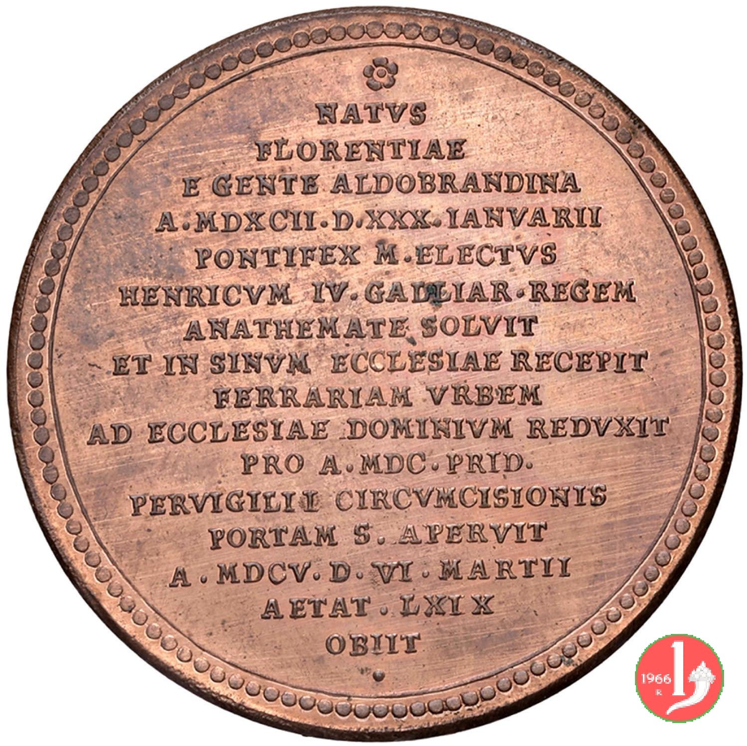Verso: nel campo: * = NATVS = FLORENTIAE = E GENTE ALDOBRANDINA = A • MDXCII • D • XXX • IANVARII = PONTIFEX M • ELECTVS = HENRICVM IV • GALLIAR • REGEM = ANATHEMATE SOLVIT = ET IN SINVM ECCLESIAE RECEPIT = FERRARIAM VRBEM = AD ECCLESIAE DOMINVM REDVXIT = PRO A • MDC • PRID • = PERVIGILII CIRCVMCISIONIS = PORTAM S • APERVIT = A • MDCV • D • VI • MARTII = AETAT • LXIX = OBIIT