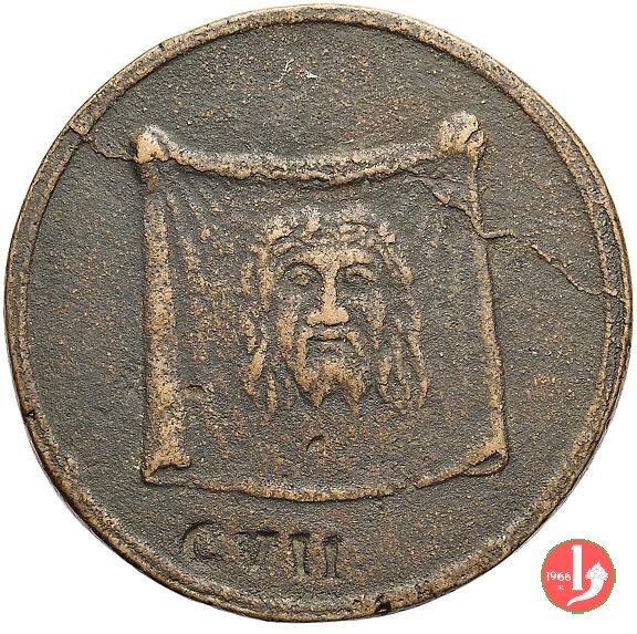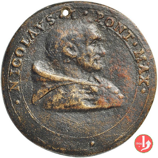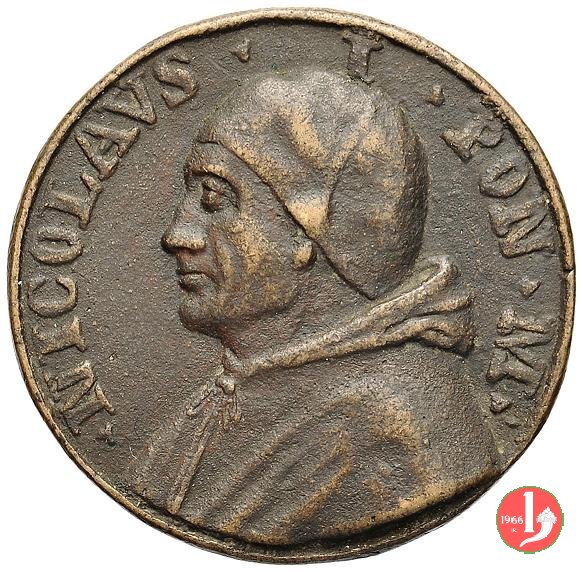 4 -Sudario della Veronica -L160 Dritto: • NICOLAVS • I • PONT • MAX • = • (tra cerchi continui) busto a dx con mozzetta Il sudario della Veronica contratto con l'immagine del volto di Cristo | |