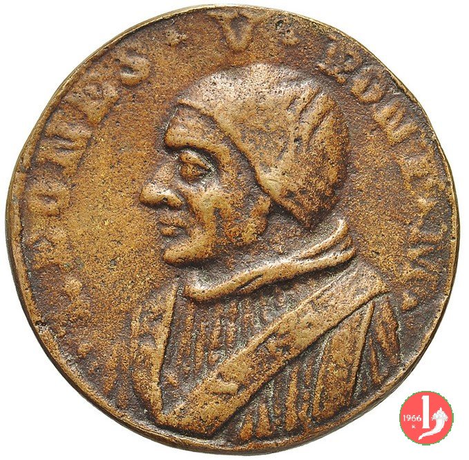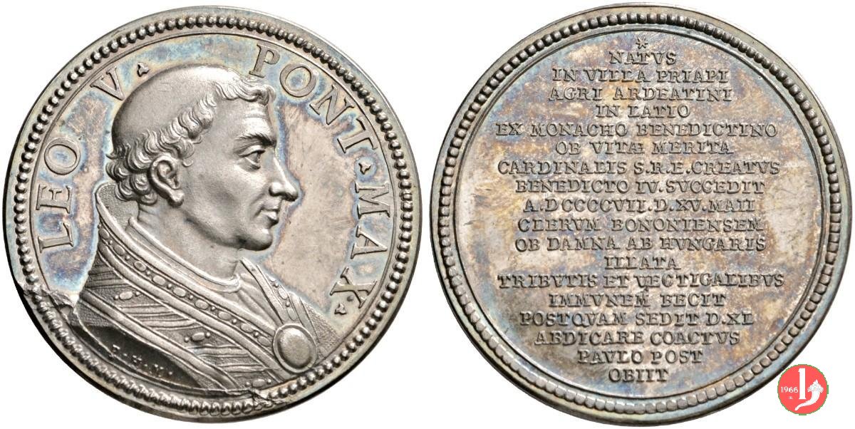 Verso: nel campo: * = NATVS = IN VILLA PRIAPI = AGRI ARDEATINI = IN LATIO = EX MONACHO BENEDICTINO = OB VITAE MERITA = CARDINALIS S • R • E • CREATVS = BENEDICTO IV SVCCEDIT = A • DCCCCVII • D • XV • MAII • = CLERVM BONONIENSEM = OB DAMNA AB HVNGARIS = ILLATA = TRIBVTIS ET VECTIGALIBVS = IMMVNEM FECIT = POSTQVAM SEDIT D • XI = ABDICATE COACTVS = PAVLO POST = OBIIT