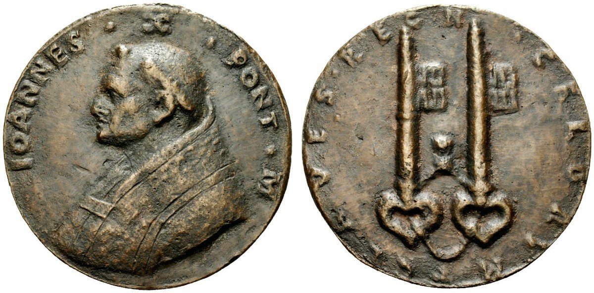 2- Di restituzione chiavi verticali parallele Dritto: IOANNES • X • PONT • M • busto a sx con piviale Chiavi parallele verticali legate da cordone | |
