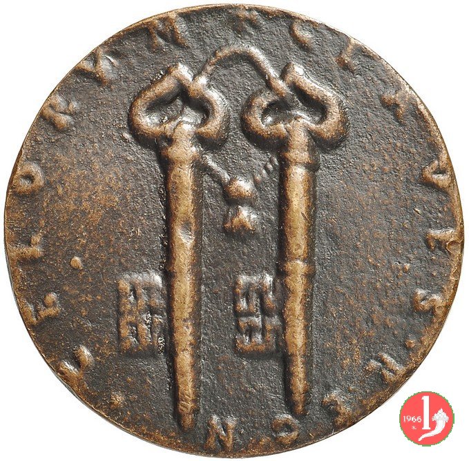 2- Chiavi parallele verticali Dritto: BENEDICTVS • VIII • P • M • busto a sx con camauro e piviale Chiavi parallele verticali legate da cordone con fiocco | |