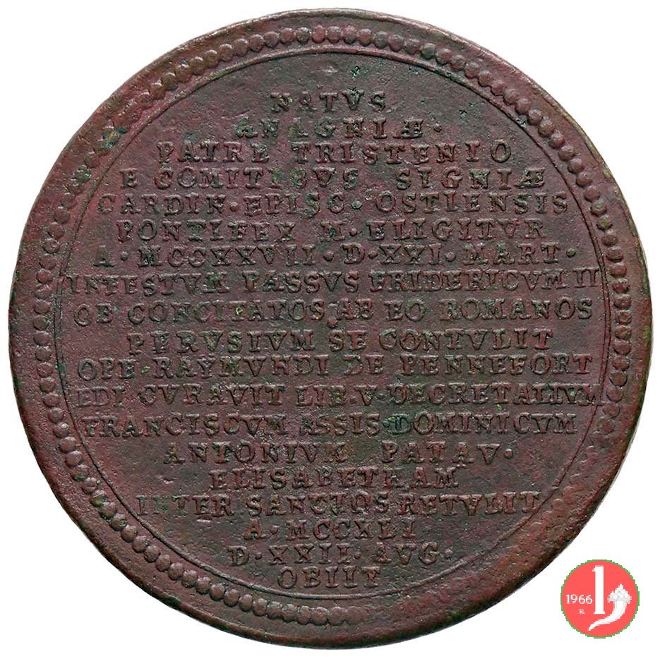 Verso: nel campo: NATVS = ANAGNIAE • = PATRE TRISTENIO = E COMITIBVS SIGNIAE = CARDIN • EPISC • OSTIENSIS = PONTIFEX M. ELIGITVR = A • MCCXXVII • D • XXI • MART • = INFESTVM PASSVS FRIDERICVM II = OB CONCITATOS AB EO ROMANOS = PERVSTVM SE CONTVLIT = OPE RAYMVNDI DE PENEFORT = EDT CVRAVIT LIB • V • DECRETATIXM = FRANCISCVM ASSIS • DOMINICVM = ANTONIVM PATAV • = ELISABETHAM = INTER SANCTOS RETVLIT = A • MCCLXI • = D • XXII • AVG • = OBIIT