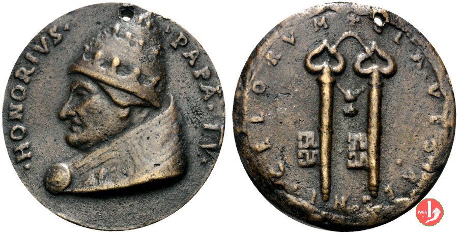 2- Chiavi verticali parallele Dritto: _ • HONORIVS • _ PAPA • IV • busto a sx con triregno e piviale chiavi verticali parallele | |