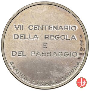 700° della morte di Celestino V 19-05-1996 Dritto: DIVI PETRI COELESTINI busto nimbato ai 3/4 a sx con pianeta nel campo a dx: Croce trilobata su tre monti con serpe in basso: O. PICCIONE in basso, circolarmente: CARDILLI NUMISM. L'AQUILA (e numerazione 132) | |