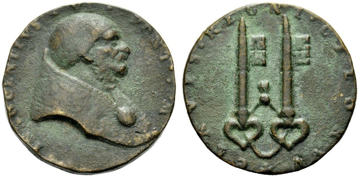 6- Di restituzione - Consegna delle Chiavi Dritto: INNOCENTIVS • VI • PONT • M • busto con camauro e piviale a dx San Pietro a dx, rivolto a sx, riceve le chiavi da mano che esce da nube | |
