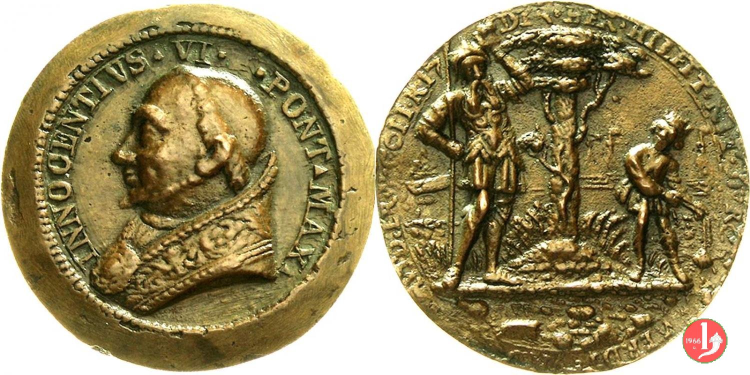 Di restituzione - Figure 42mm Dritto: INNOCENTIVS • VI • _ • PONT • MAX • busto a sx con piviale e razionale Figure in piedi presso albero una con asta e l'altra con clava |