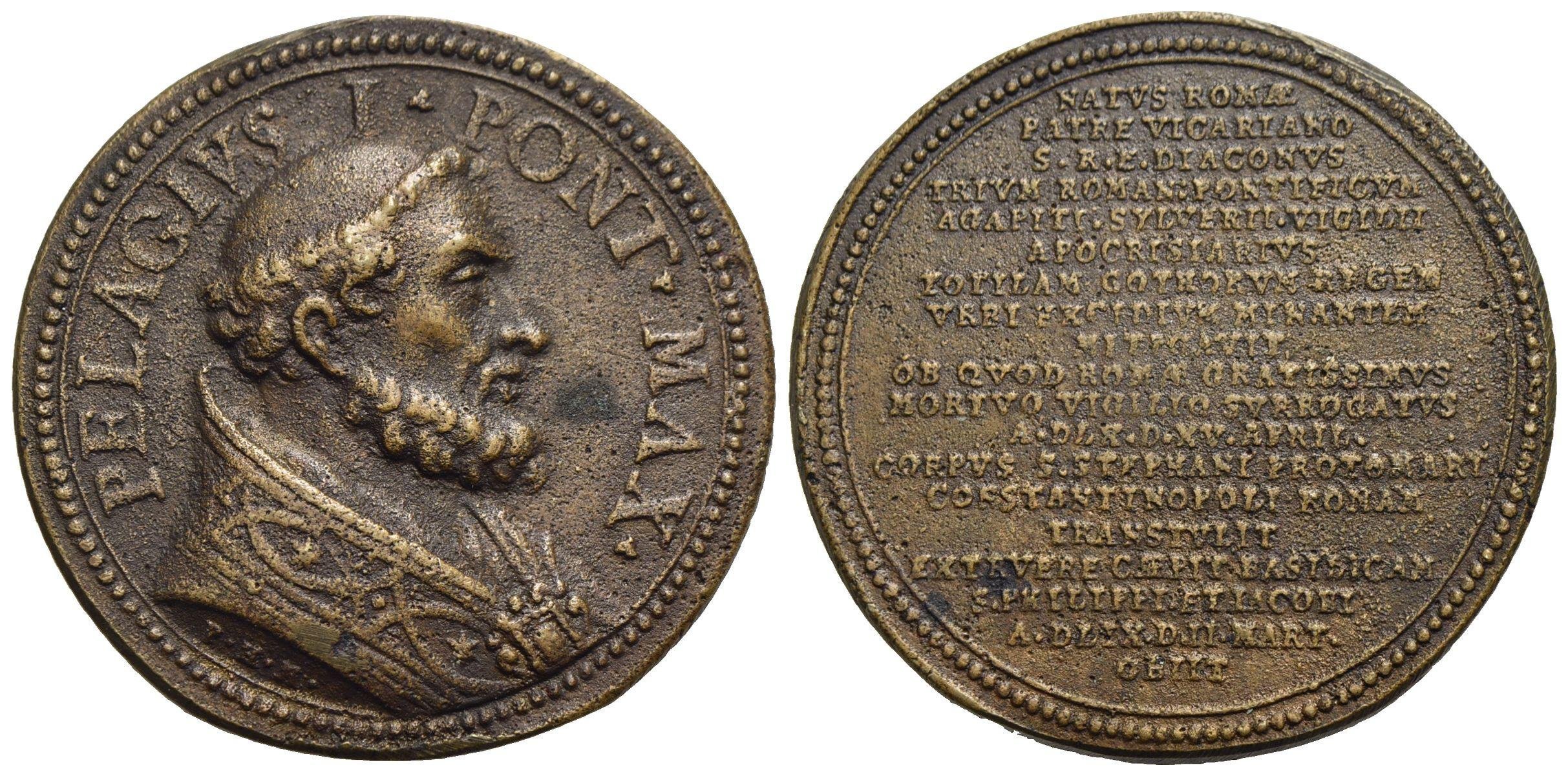 18 - Di restituzione - Stemma Papale Dritto: _ • PELAGIVS • I • PONT • MA • busto a dx con piviale |