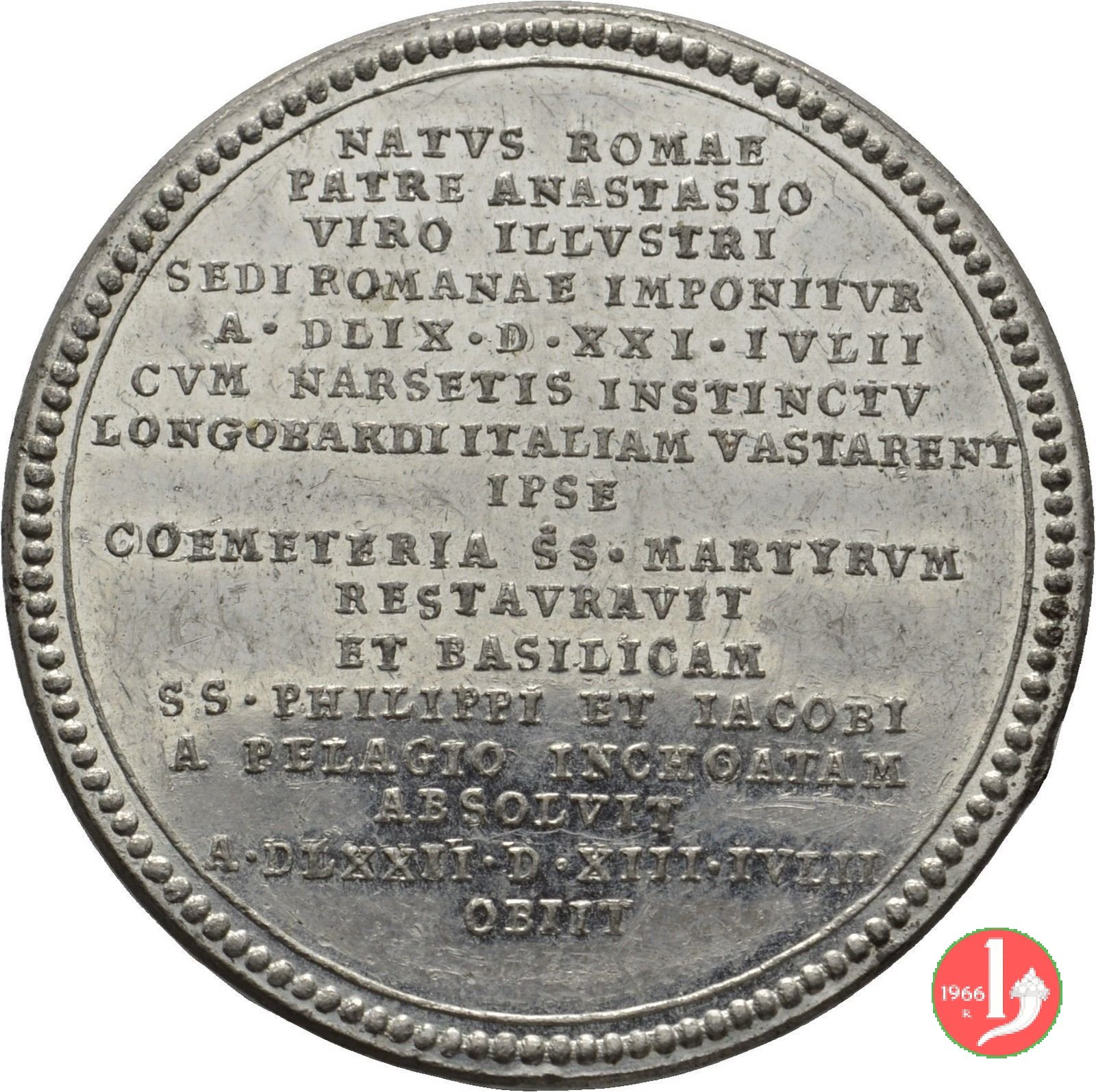 Verso: nel campo: NATVS ROMAE = PATRE ANASTASIO = VIRO ILLVSTRI = SEDI ROMANAE IMPOSITVR = A • DLIX • D • XXI • IVLII = CVM NARSETE INSTINCTV = LONGOBARDI ITALIAM VASTARENT = IPSE = COEMETERIA SS. MARTYRVM = RESTAVRAVIT ET BASILICAM = SS. PHILIPPI ET IACOBI = A PELAGIO INCHOATAM = ABSOLVIT = A • DLXXII • D • XIII • IVLII = OBIIT