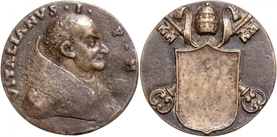 6- Di restituzione - Consegna delle Chiavi Dritto: VITALIANVS • I • _ P • M busto a dx con piviale San Pietro, volto a sx, riceve le chiavi da braccio uscente da una nube, in alto, a sx | |