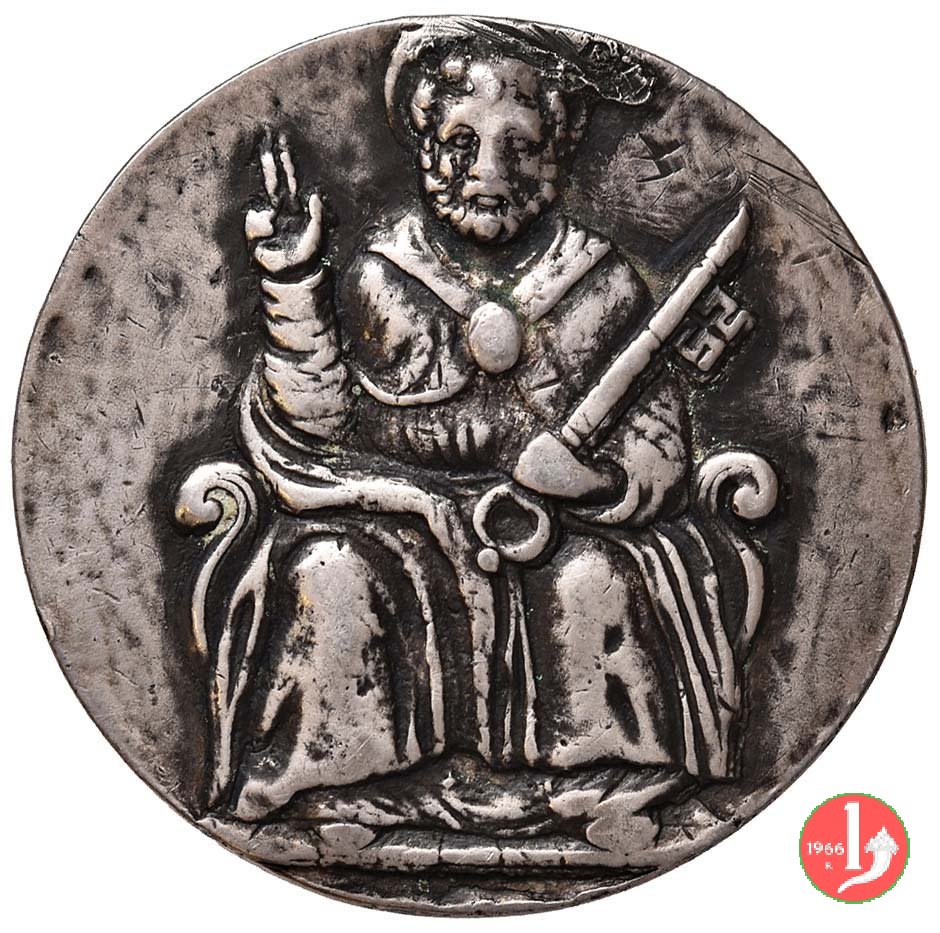6- Di restituzione - Consegna delle Chiavi Dritto: STEFANVS • _ III • P • M • busto a dx con mitra e piviale San Pietro a dx, rivolto a sx, riceve le chiavi da mano che esce da nube | |