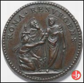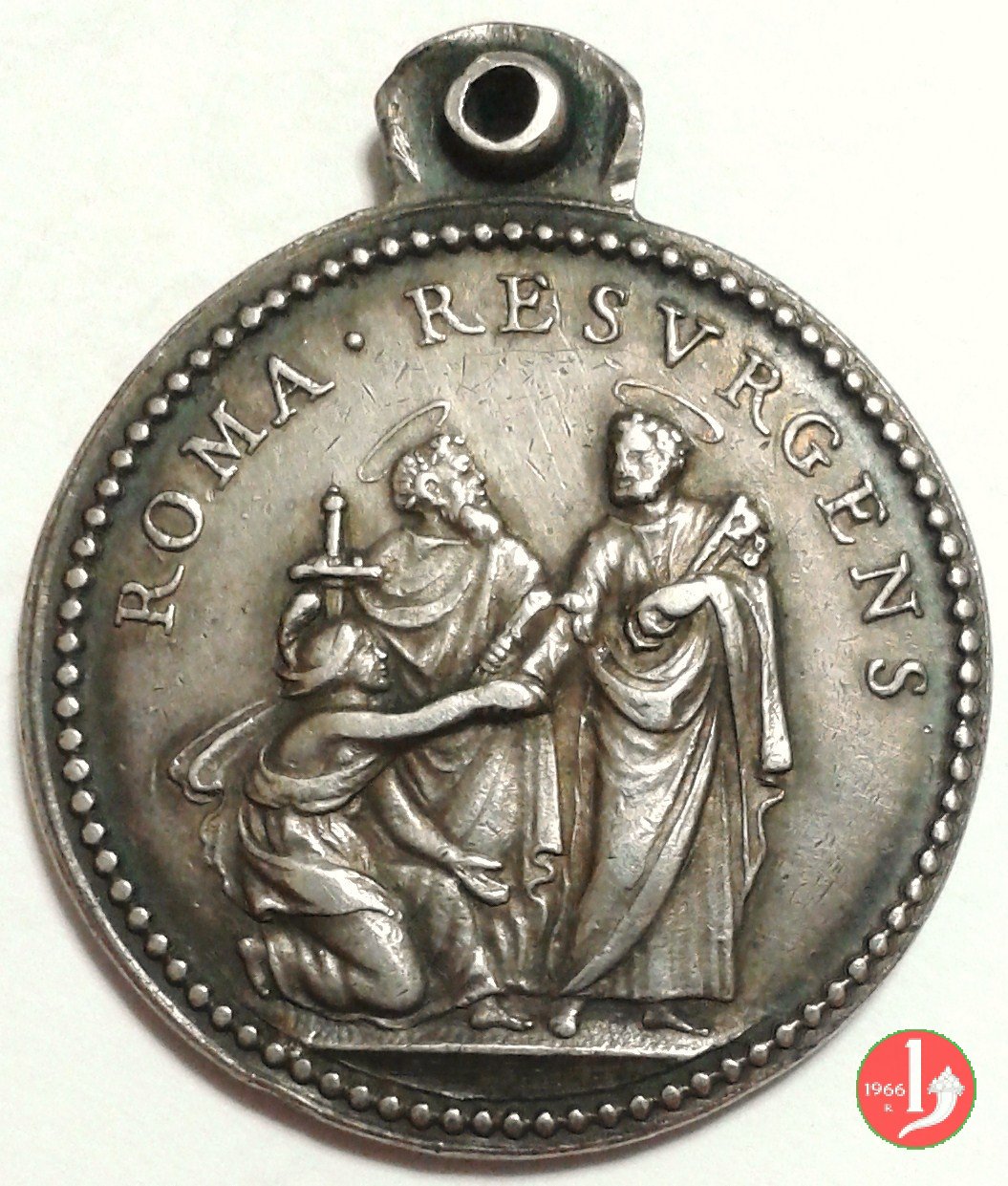 Figura allegorica di Roma genuflessa a sx porge la mano a S. Pietro con le chiavi a dx, al centro San Paolo con la spada