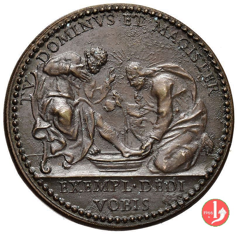 Verso: Gesú lava i piedi a S. Pietro, in alto lampada, sullo sgabello di S. Pietro: •AH.