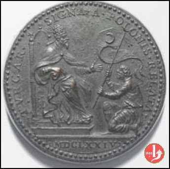 Nobile polacco a dx genuflesso, consegna al Papa, in trono, lo stendardo catturato all'esercito Turco