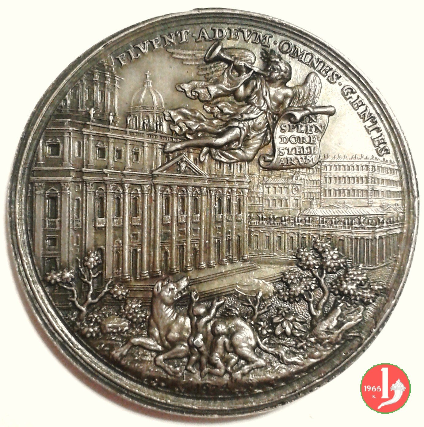 La Facciata della Basilica di S. Pietro con i Palazzi Apostolici, sotto la lupa con i gemelli, in alto angelo in volo suona la tromba e regge cartiglio iscritto: IN = SPLEN = DORE = SPELL = ARVM