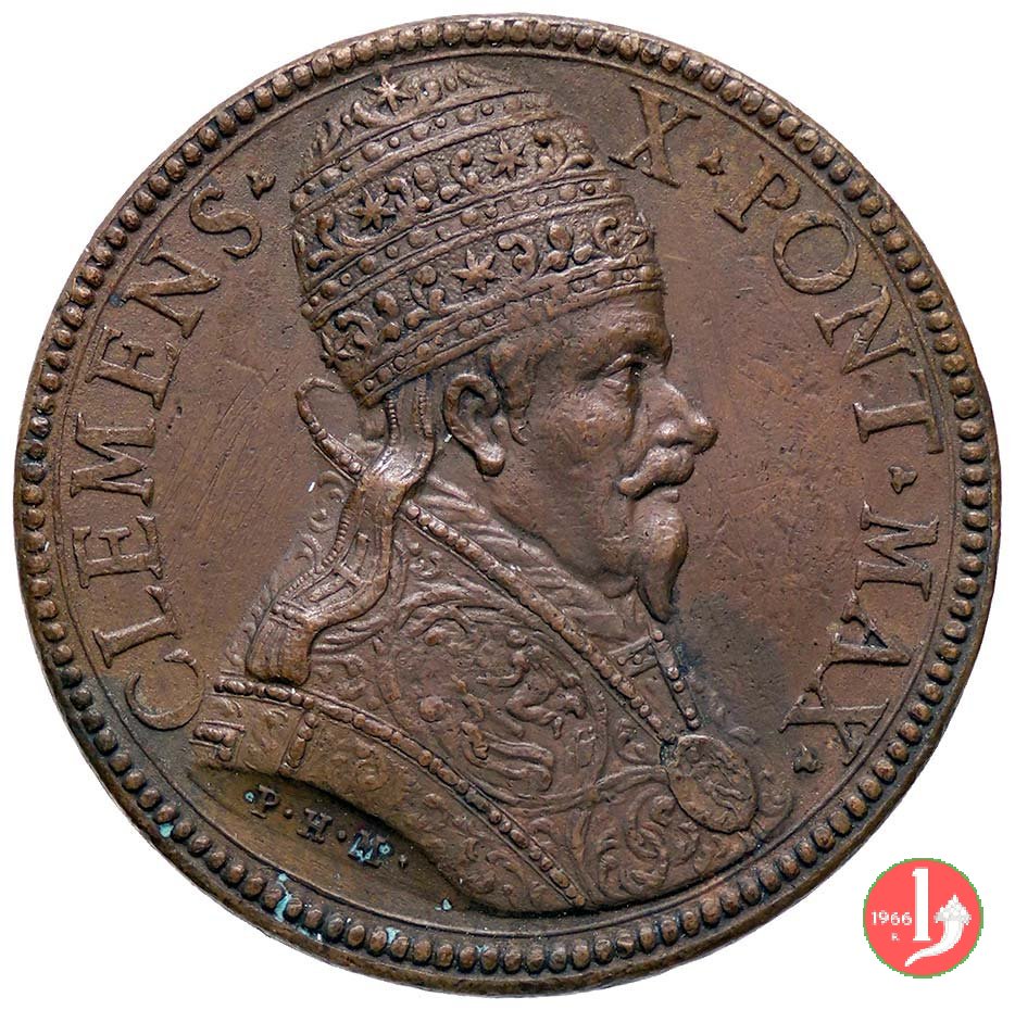 Enciclopedia Numismatica Internazionale -M87 Dritto: CLEMENS X _ PONT MAXIMVS Busto con triregno e piviale a Dx nel campo in basso a sx: AFFER stemma di Clemente X, sotto in nastro: DE FLUMINE MAGNO |