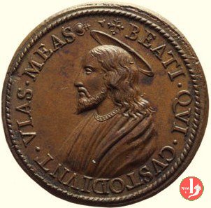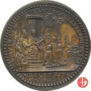 Canonizzazione del 1622 -M138 Dritto: GREGORIVS • XV • PONT • MAX • A • III • (punti celtici) busto con piviale a dx sul taglio spalla: • I • A • M • sotto: • 1623 • il Papa, attorniato da Vescovi, seduto in trono con triregno e piviale, volto a dx, legge il decreto di canonizzazione dei cinque Santi, la scena è sormontata dalla Colomba dello Spirito Santo raggiante in esergo: * DECERNIT * = • 1622 • | |