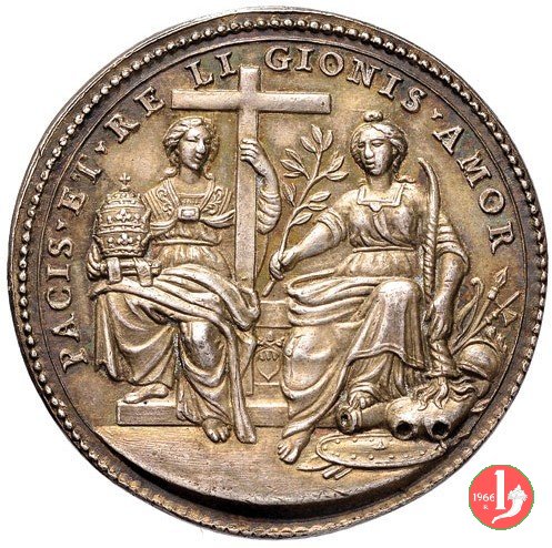 A . III - Mediazione Pontificia tra Francia e Spagna -M135 Dritto: GREGORIVS • XV • PONT • MAX • A • III (punti celtici) busto con piviale a dx sul taglio spalla: • I • A • M • sotto: • 1623 • figure allegoriche della pace e della religione in forma di donne sedute di fronte l'una con tiara e croce, l'altra con ramo d'ulivo | |