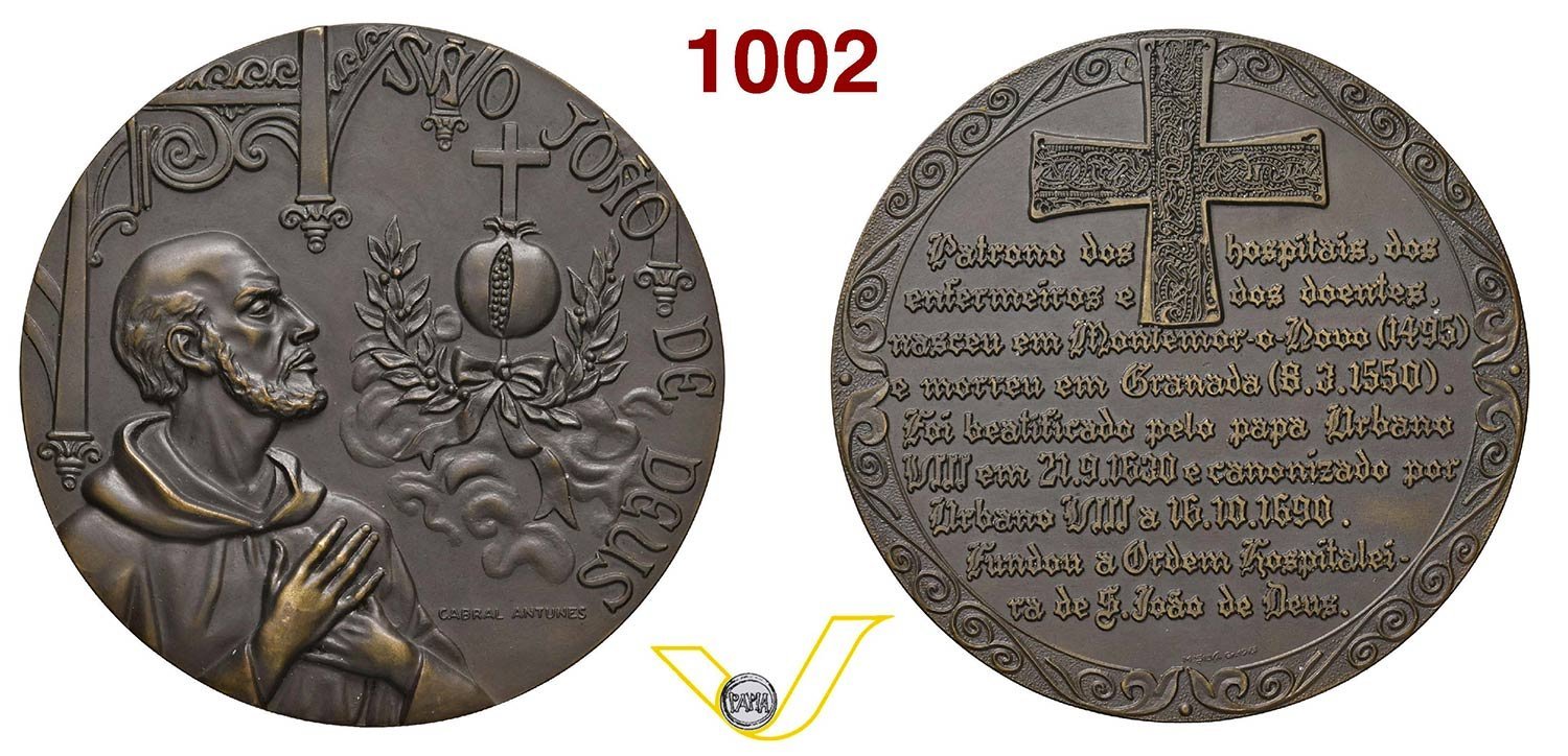 nel campo: PATRONO DOS _ HOSPITAIS, DOS = ENFERMIEROS E _ DOS DOENTES, = NASCEU EM MONTEMOR O Novo (1495) = E MOREU EM GRANADA (8.3.1550) = FOI BEATIFICADI PELO PAPA URBANO = VIII EM 21.9.1630 E CANONIZADO POR = URBANO VIII (sic! ALESSANDRO VIII) A 16.10.1690. = FUNDAO A ORDEM HOSPITALEI- = RO DE S. JOAO DE DEUS.