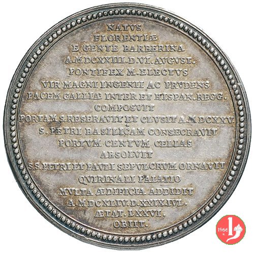 Verso: NATVS = FLORENTIAE = E GENTE BARBERINA = A • MDCXXIII • D • VI • AVGVST • = PONTIFEX M • ELECTVS = VIR MAGNI INGENII HAC PRVDENS = PACEM GALLIAE INTER ET HISPAN - REGG • = COMPOSVIT = PORTAM S • RESERVAVIT ET CLVSIT A • MDCXXV • = S • PETRI BASILICAM CONSECRAVIT = PORTVM CENTVM CELLAS = ABSOLVIT = S • S • PETRI ET PAVLI SEPOLCRVM ORAVIT = QVIRINALI PALATIO = MVLTA AEDIFICIA ADDIDIT = A • MDCXLIV • D • XXIX • IVL • =