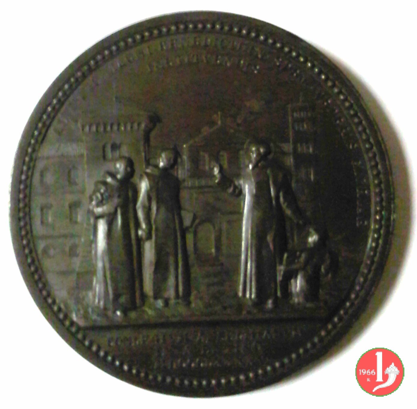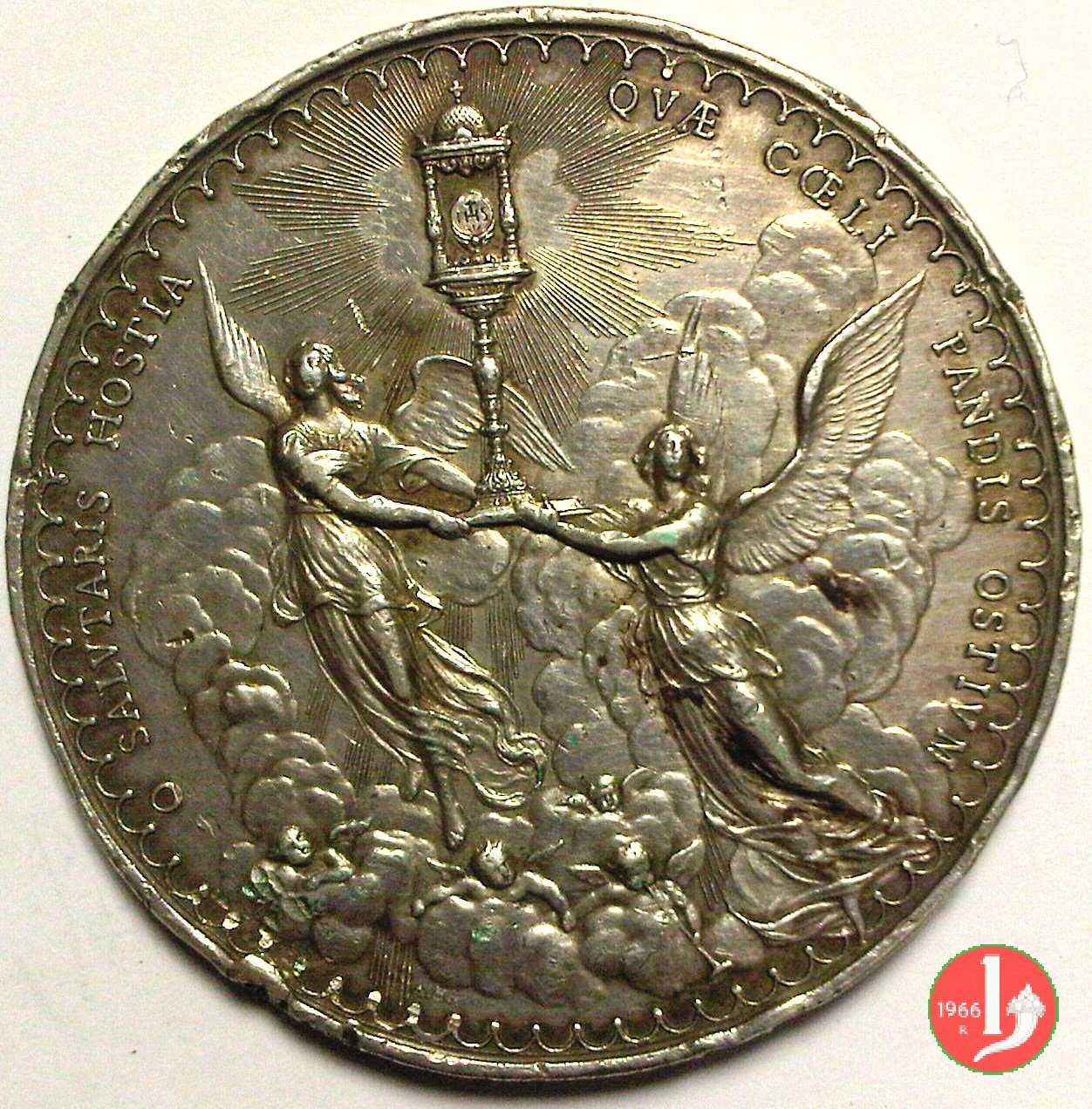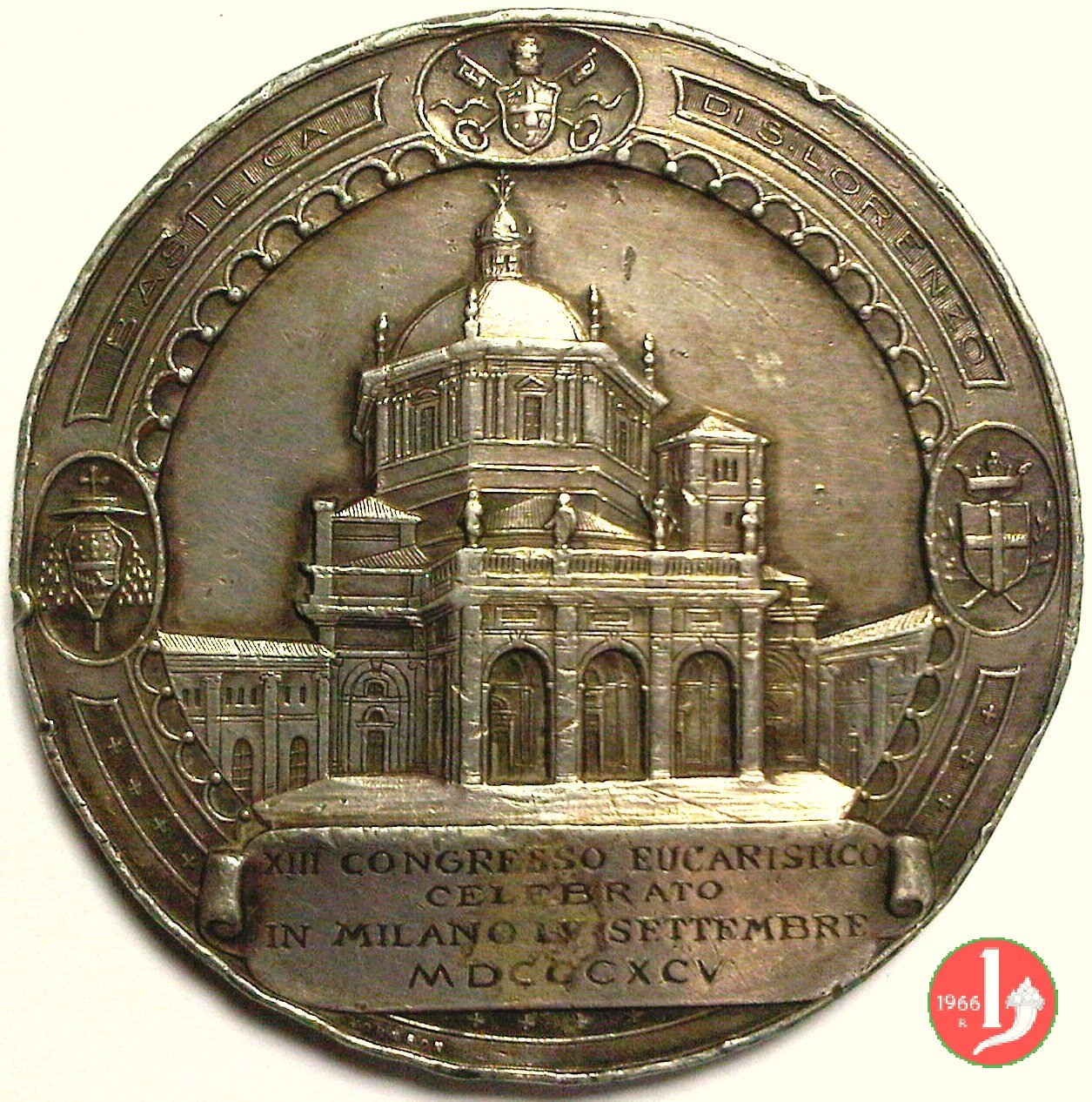 7-XIII Congresso Eucaristico di Milano Dritto: ai lati entro ovali: a sx: Stemma del Card. Ferrari sormontato da galero a 15 nodi in alto: Stemma Papale su chiavi decussate e sormontato da triregno a dx: Stemma di Milano tra rami e coronato tra gli ovali in riquadri: BASILICA _ DI S. LORENZO vista anteriore della Basilica di San Lorenzo in Milano sotto in cartiglio incuso: XIII CONGRESSO EUCARISTICO = CELEBRATO = IN MILANO IV SETTEMBRE = MDCCCXCV in esergo: + + + + sotto a sx: JOHNSON due Angeli sorreggono ostensorio con ostia raggiante tra le nubi, sotto quattro angeli in basso a sx: A.C. | |