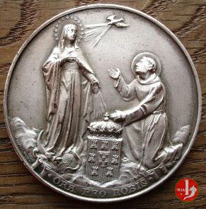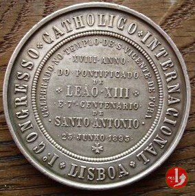 6-I° Congresso Cattolico Internazionale a Lisbona Dritto: La Madonna incoronata, radiata dalla colomba dello Spirito Santo, schiaccia la testa di un drago, prostrato ai suoi piedi Sant'Antonio nimbato orante al centro in basso: stemma della Casa di Braganza coronato a sx: I • BARNES ANVERS sotto in cartiglio: • ORA PRO NOBIS • nel cerchio interno perlinato: • CELEBRANDO • NO • TEMPO • DE • S • VINCENTE • DE • FORA • nel campo: • XVIII • ANNO • = • DO • PONTIFICADO • = DE = * LEAO • XIII * = • E • 7° • CENTENARIO • = DE = • SANTO ANTONIO • = • 25 • JUNHO • 1895 • = + | |