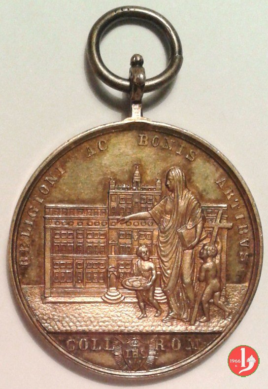 5-Collegio Romano -A. XVIII Dritto: LEO • XIII • PONTIFEX • MAXIMVS • ANNO • XVIII * busto con mozzetta, berretto e stola a sx sotto: F • BIANCHI • La figura allegorica della Religione velata tra due fanciulli indica il Palazzo del Collegio Romano in esergo: COLL _ ROM ai lati di scudetto raggiante con IHS e tripla Croce | |
