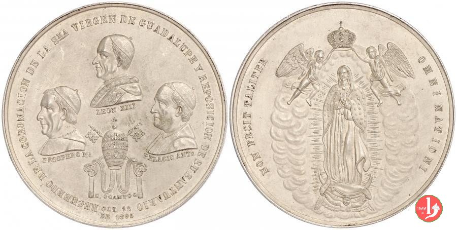11-Madonna di Guadalupe Dritto: RECUERDO DE LA CORONACION DE LA Sma VIRGEN DE GUADALUPE Y REPOSICION DE SU SANTUARIO in alto: busto a sx di Leone XIII sotto, ai lati, i busti, a sx, degli Arcivescovi di Città del Messico: Prospero Maria Alarcon del la Barquera e Pelagio Antonio de la Bastida sotto: triregno su chiavi decussate in basso: C. OCAMPO G = OCT. 12 = DE 1895 la B. V. in piedi di fronte, entro nimbo raggiante, coronata da due Angeli | |