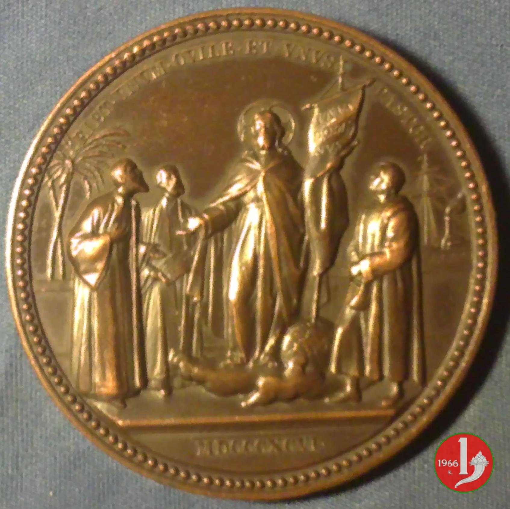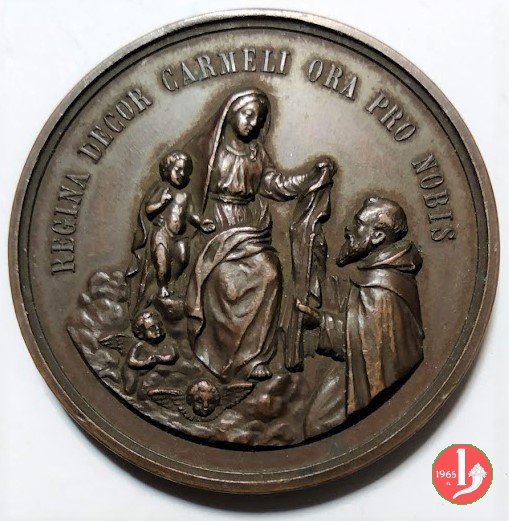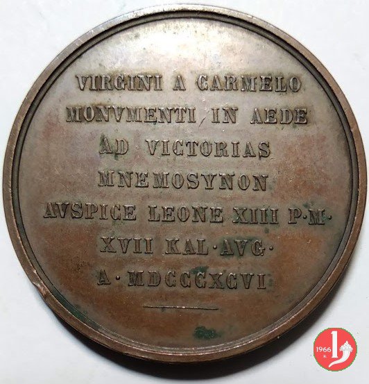 Verso: nel campo: VIRGINI A CARMELO = MONVMENTI IN AEDE = AD VICTORIAS = MNEMOSYNON = AVSPICE LEONE XIII P • M • = XVII KAL • AVG • = A • MDCCCXCVI = -