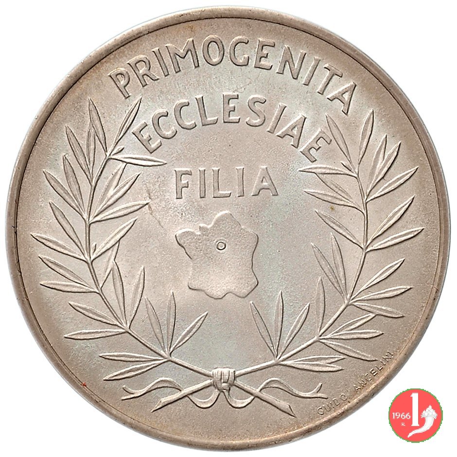 Verso: nel campo: ✠ = ANNO • DNI • MDCCCXCVI = A • D • XVI • KAL • IVL = S • P • LEONE • PAPA • XIII • ECCLESIAM • DEI = MIRA • SAPIENTIA • GVBERNANTE = HANCCE • BASILICAM • FOROVETERI = IN • HONOREM • B • M • V • IMMACVLATE = EX • LVGDONENSIVM • VOTO = AB • HINC • XXVI • ANNIS • INCHOATAM = TANDEM • FELICITER • EXTRVCTAM = RR • DD • PETRVS • COVILIAE • ARCH • LVGD • ET • VIEN = QVANTO • APPARATO • POTVIT = ADSTANTE • PRAECLARA • EPISCOPORVM = CORONA = FREQVENTIQVE • CLERI • ET • POPVLI = CONVENTV = RITE • CONSECRAVIT = ET • DEDICAVIT = ✠