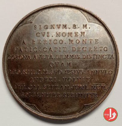 Verso: nel campo entro cornice quadrilobata: SIGNVM • B • M • = CVI • NOMEN = A • BERICO • MONTE = VATIC • CAPIT • DECRETO = CORONA • AVREA • A • GEMMIS • DISTINCTA = QVAM = LEO • XIII • P • M • SVO • IPSIVS • ANNVLO = AVGERI • VOLVIT = VIII  • KAL • SEPT • AN • JVBIL • MCM  = SOLENMITER • REDIMITVR