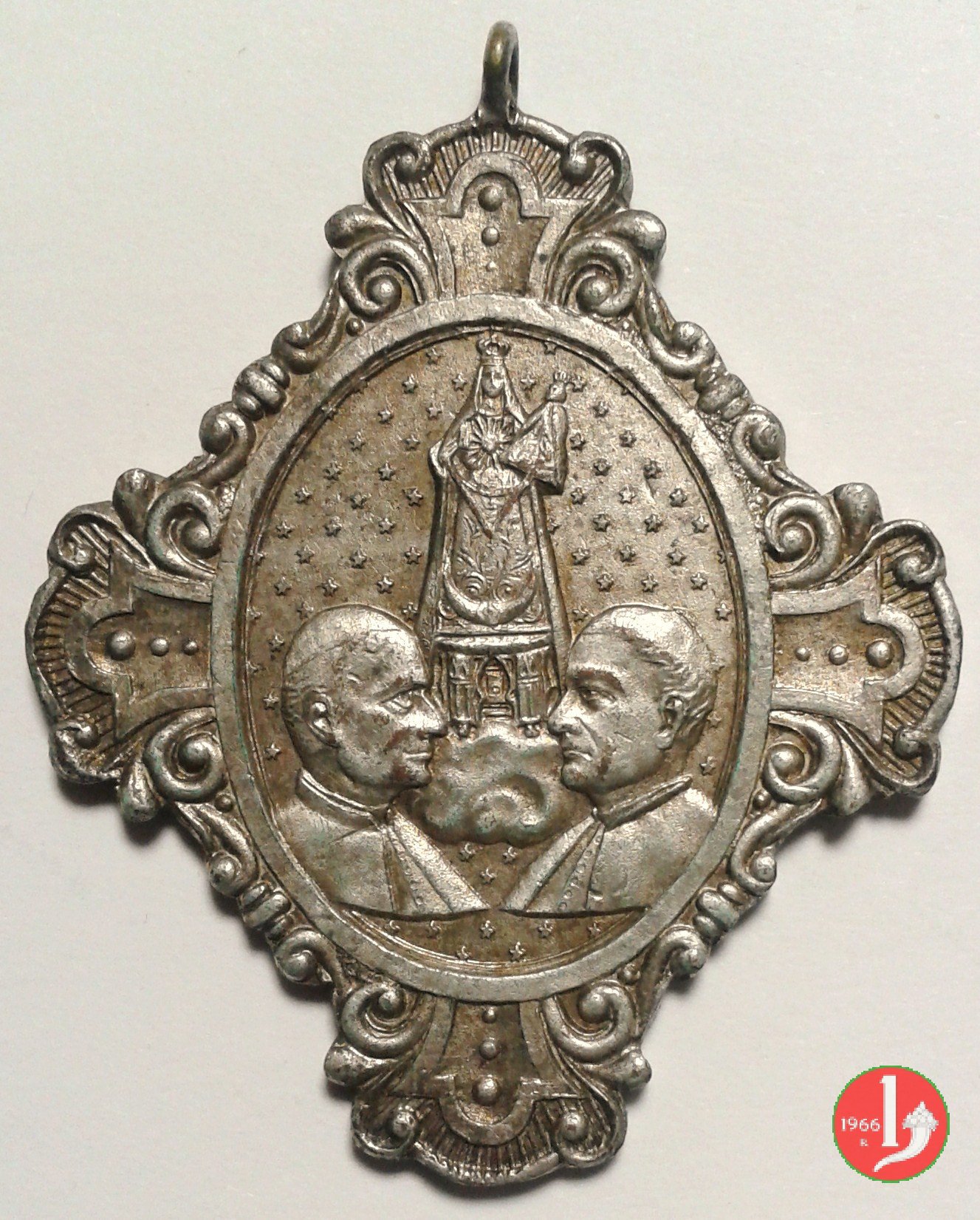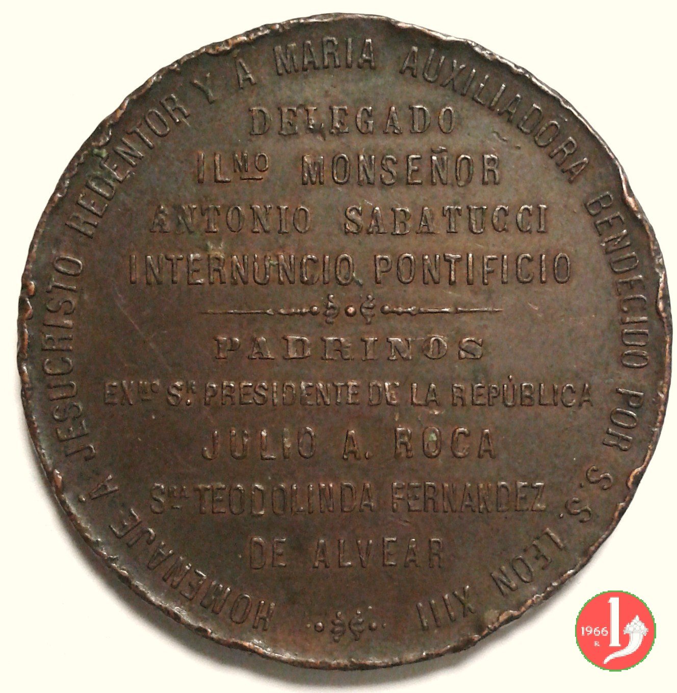 Dritto: entro cornice floreale, in ovale a campo stellato: busti affrontati di Leone XIII e del Vescovo di Benos Aires , al centro l'immagine della B. V. di Cordoba