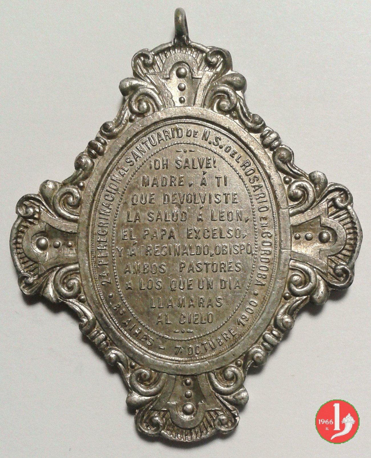 Verso: entro cornice floreale, in ovale: 24 PREGRINACIONAL SANTUARIO DE N. S. DEL ROSARIO DE CORDOBA = • B.s AIRES - 7 OCTOBRE 1900 •