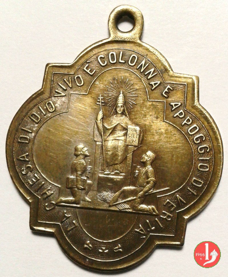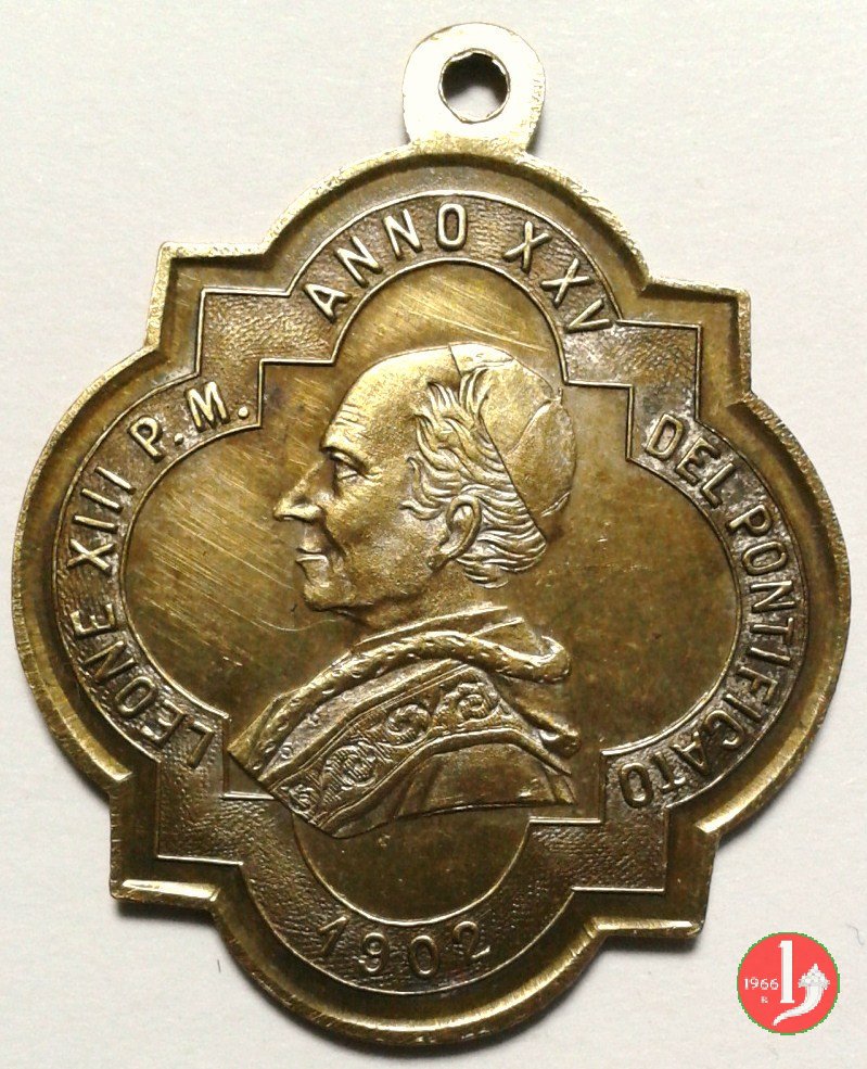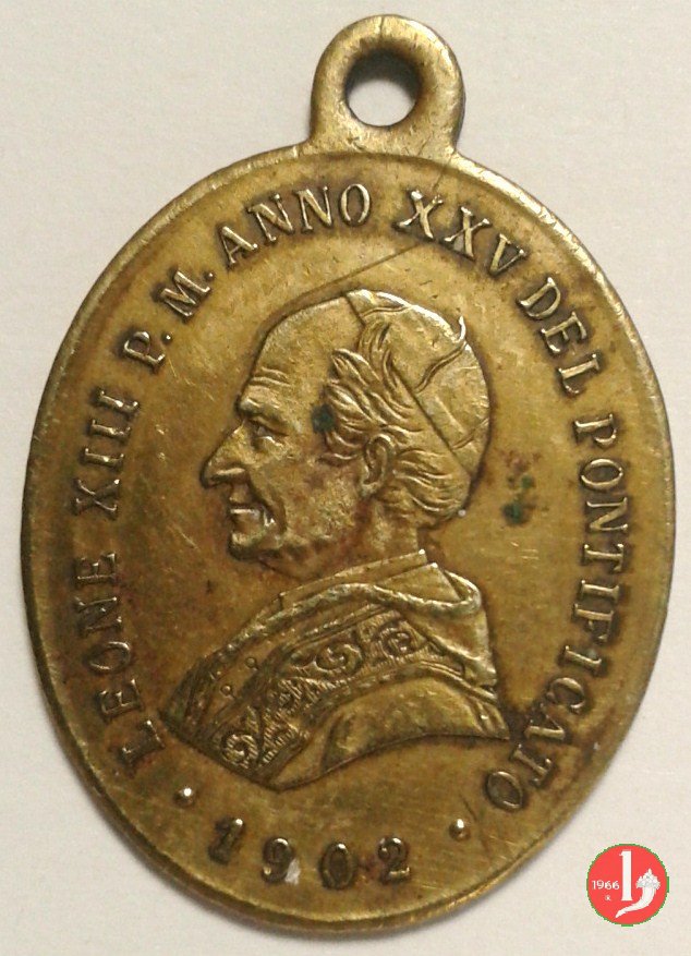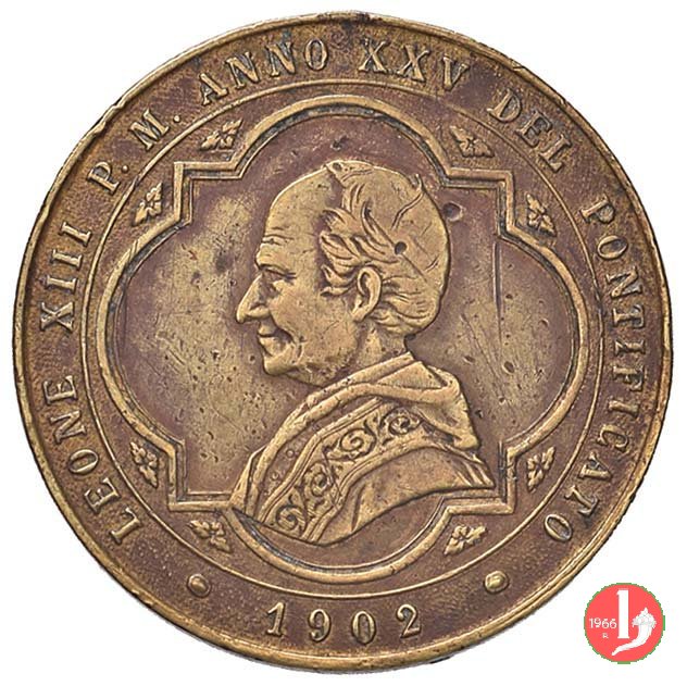 19- 25° di Pontificato -La chiesa 25mm Dritto: LEONE XIII P. M. ANNO XXV DEL PONTIFICATO = • 1902 • entro cerchio continuo e cornice quadrilobata e cuspidata: busto a sx con berretto, mozzetta e stola sotto: S • J • entro cerchio continuo e cornice quadrilobata e cuspidata: La figura allegorica della chiesa seduta in trono di fronte con triregno raggiante e tripla Croce, ai lati due figure genuflesse: una con tomo, l'altra con attrezzi | |