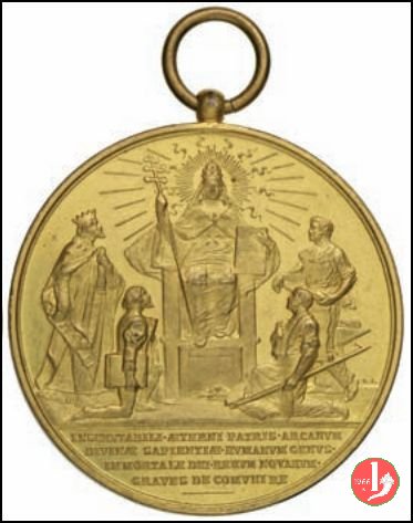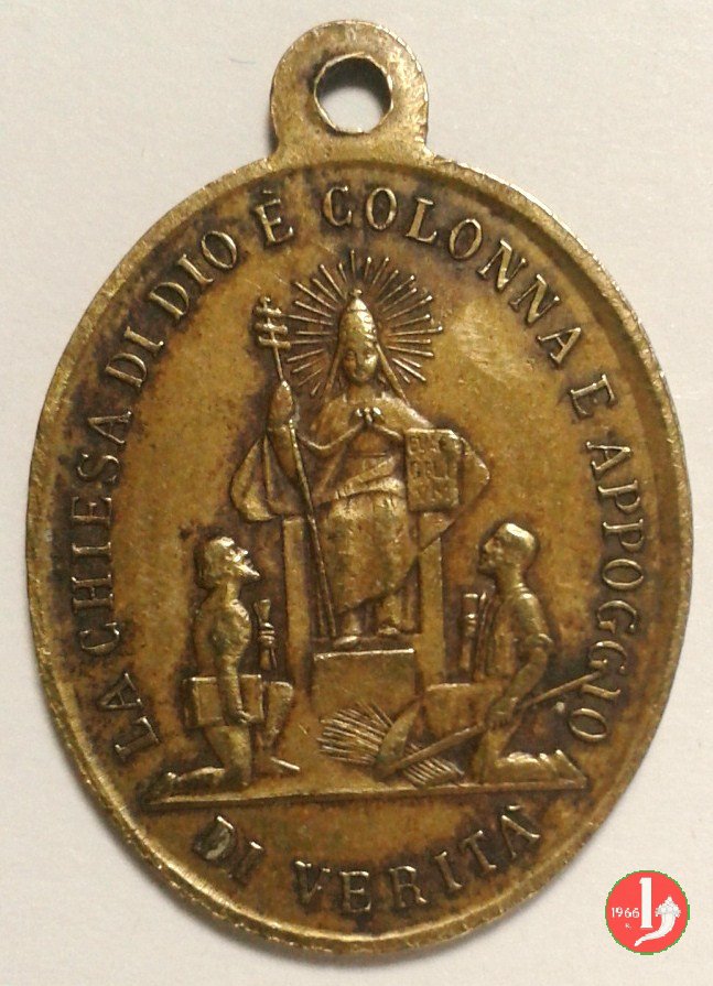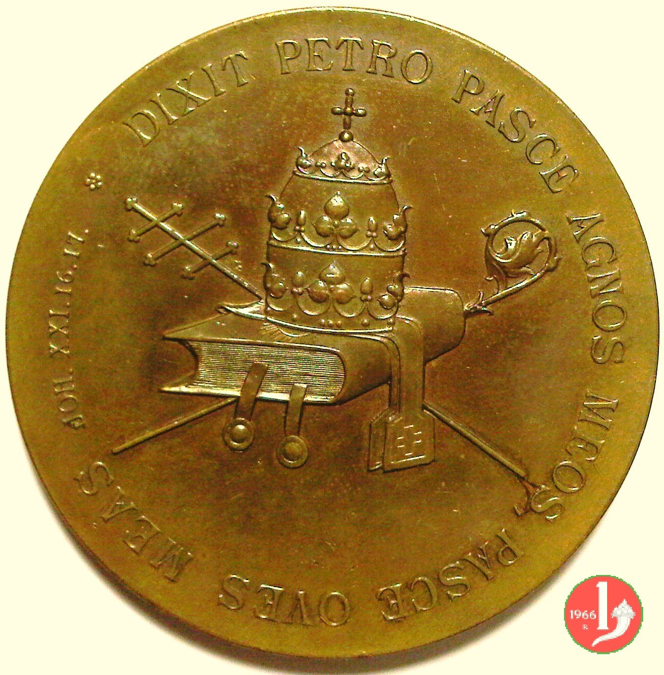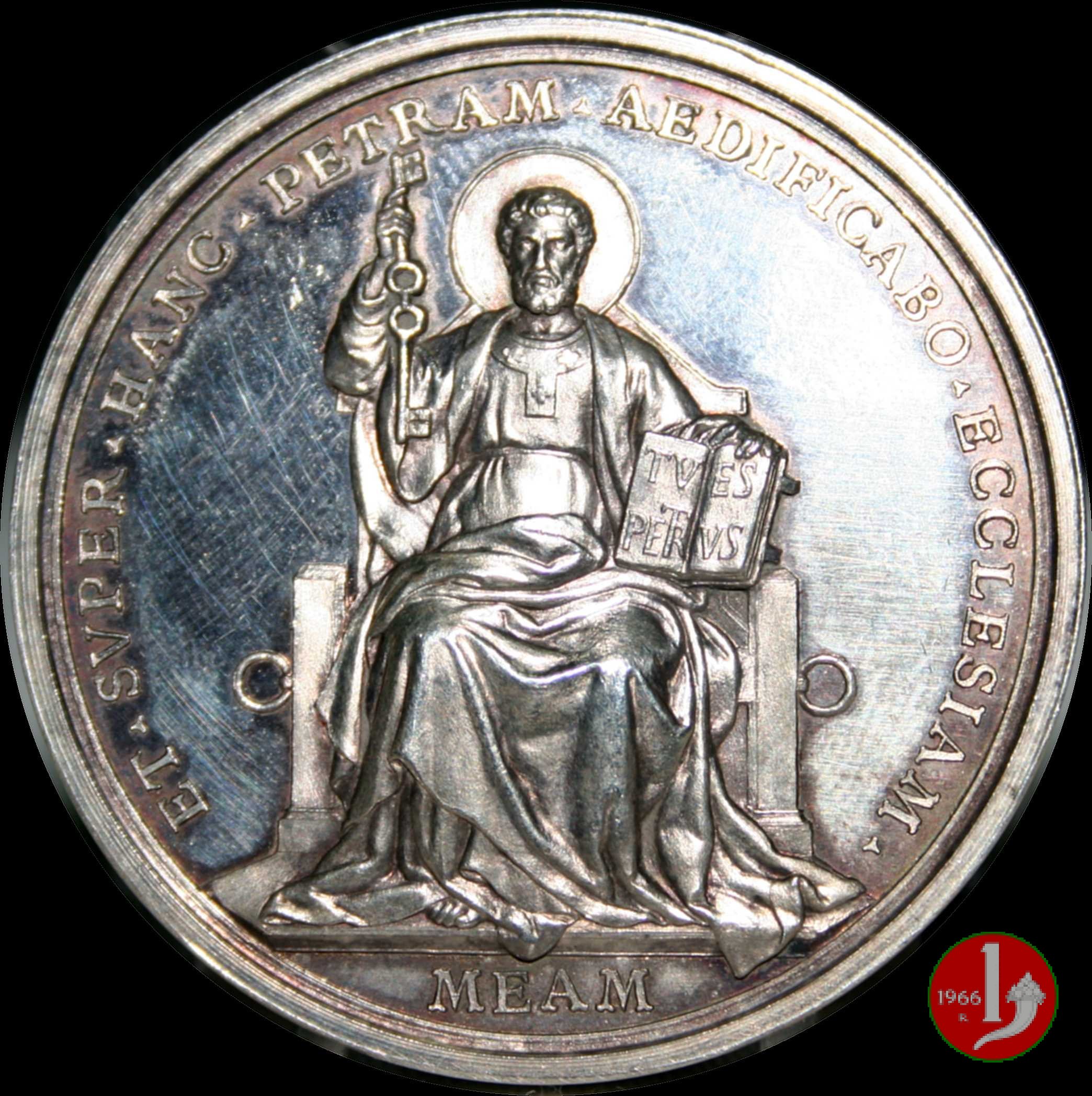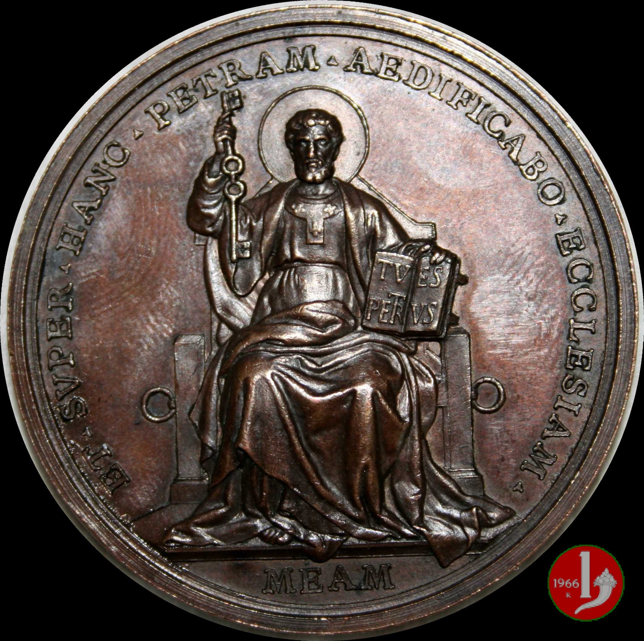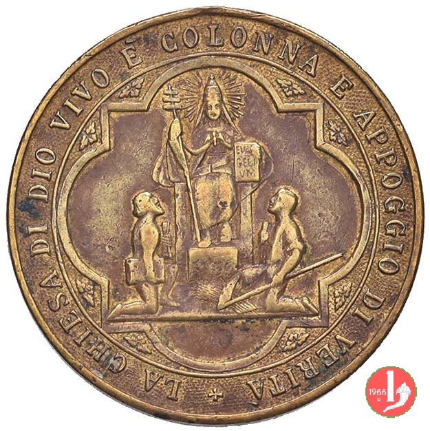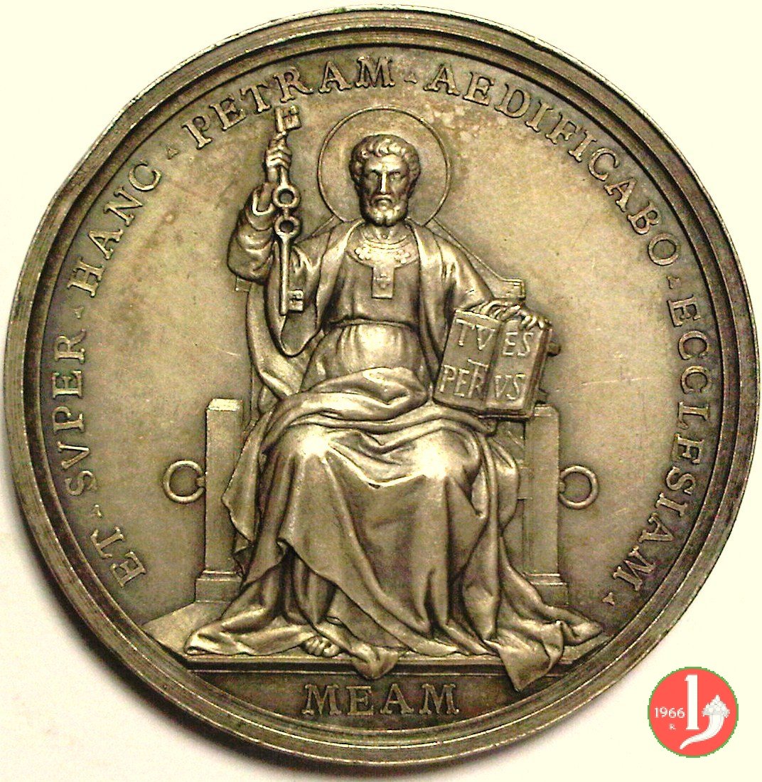 41- 25° di Pontificato - Stemma Dritto: XXV • ANNO • PONTIFICATI • PAPA busto di 3/4 a sx con zucchetto, abito talare, Croce pettorale e mantello firma indecifrabile sulla spalla dx: RIZILLON (?) Stemma Papale tra rami di palma e quercia, sormontato da triregno e su chiavi decussate e da PAX, sotto entro nastro: DIES _ PETRI | |