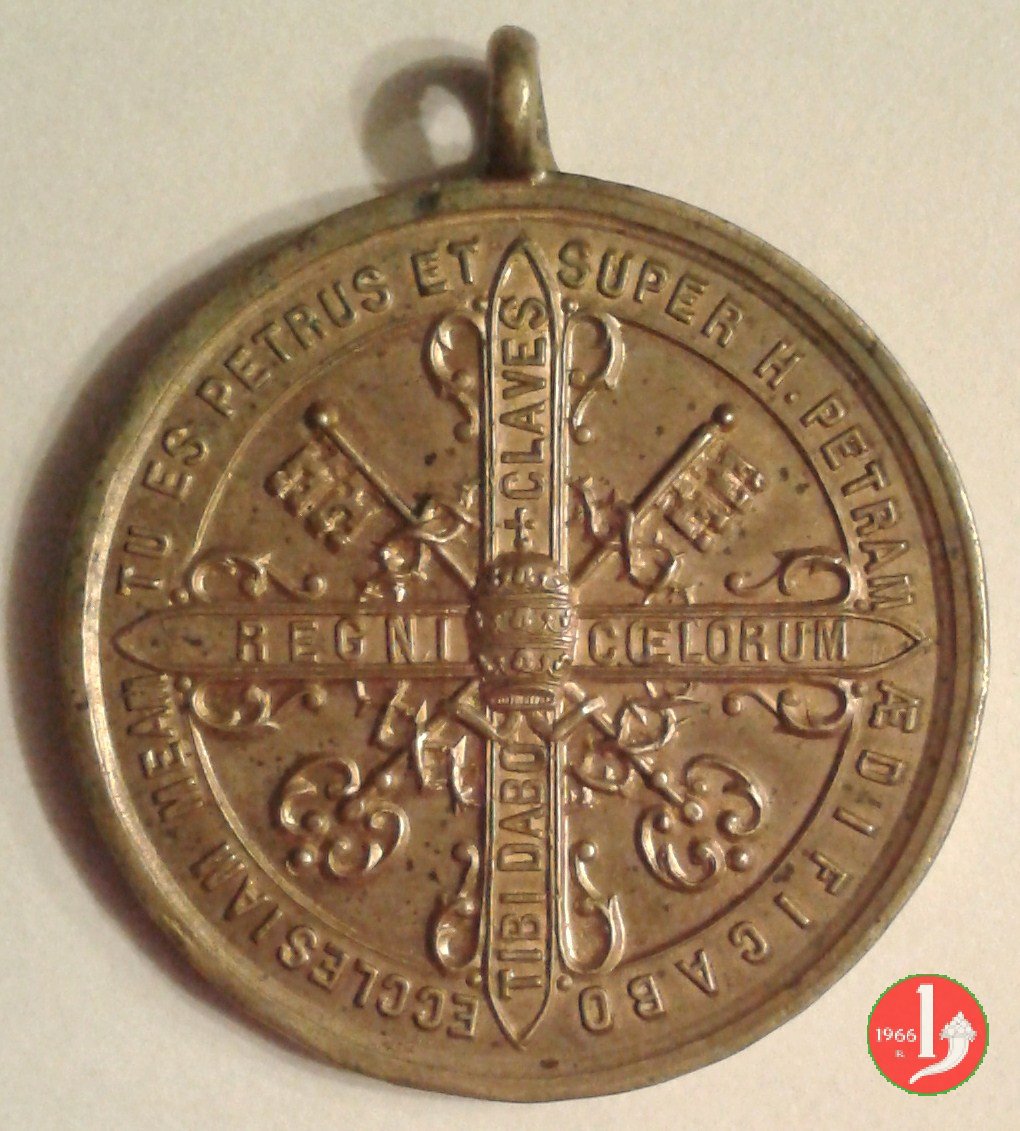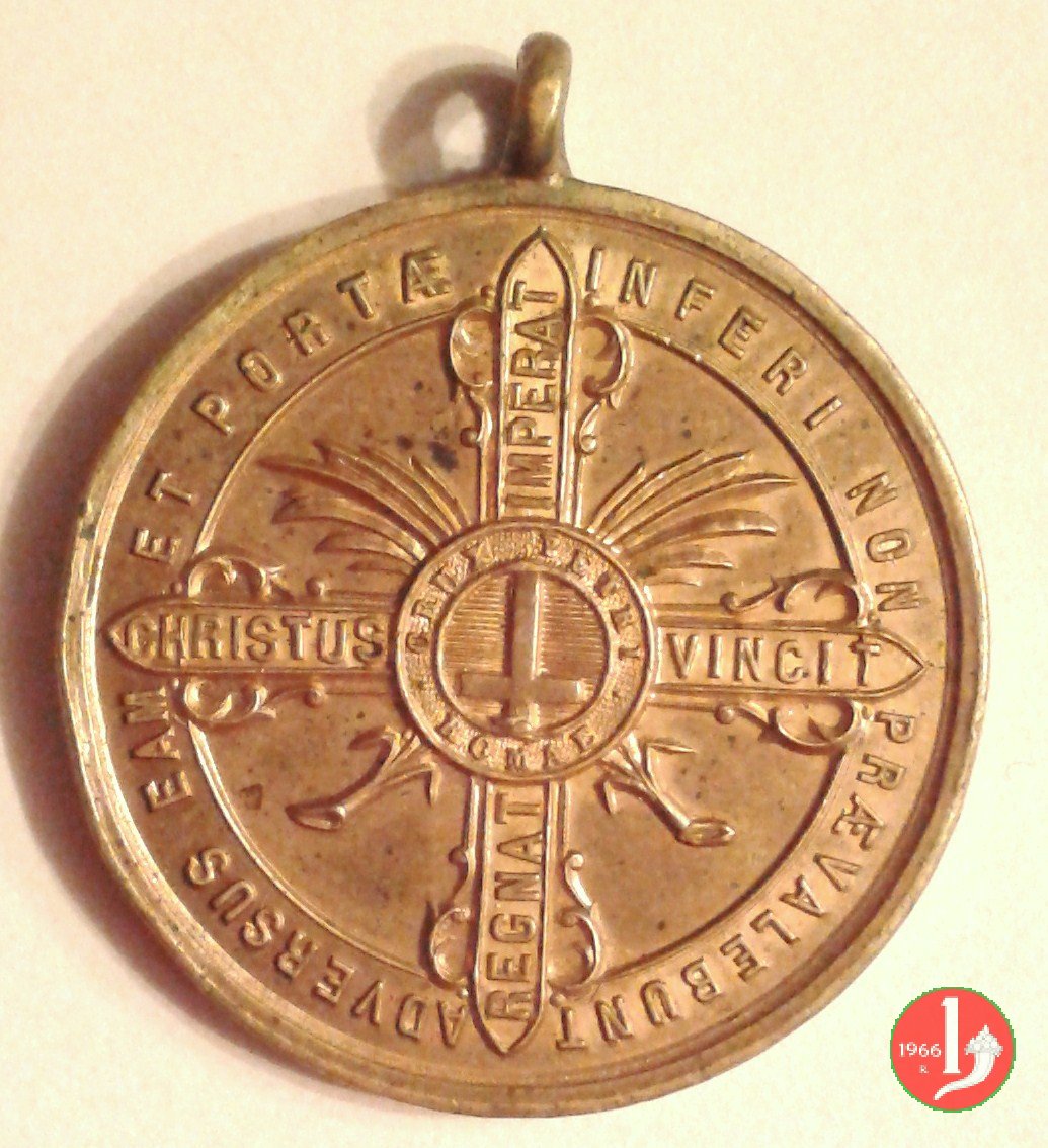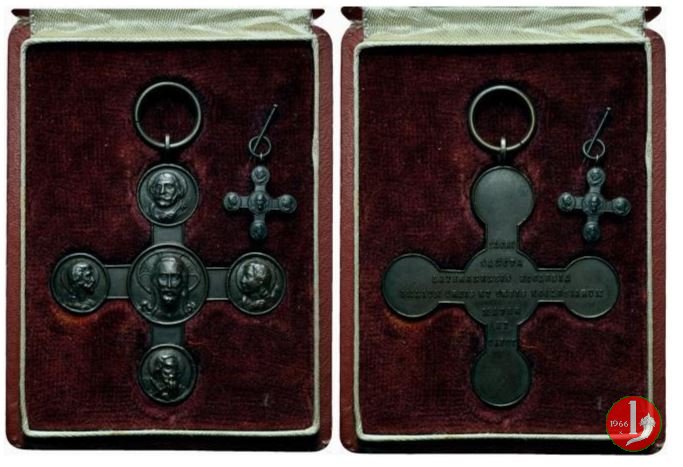 37- Croce di Leone XIII Dritto: TU ES PETRUS ET _ SUPER H. PETRAM _ AEDIFICABO _ ECCLESIAM MEAM triregno su Croce e chiavi decussate fermate da corona di spine sui bracci della Croce: TIBI DABO _ CLAVES _ REGNI _ COELORUM al centro della Croce su rami di palma decussati: CRUX PETRI = ROMAE Croce (capovolta) di San Pietro sui bracci della Croce: CHRISTUS _ VINCIT _ IMPERAT _ REGNAT | |