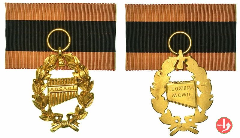 31-Accademia degli Arcadi Dritto: su nastro disposto sul flauto: ARCADI in basso, a dx, sul ramo: P.V. | |