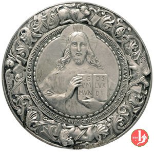 9-XXV Pontificato Cristo-Festa a Milano 53mm Dritto: nel cerchio interno a cornice floreale:. LEONI • XIII • P • M • ADSERTORI • SAPIENTIAE • CHISTIANAE • = A • MCMIII • KAL • MART • NATALI • SACRI • PRINCIPATVS • EIVS • XXV bisto con berretto, mozzetta e stola s dx Gesú di fronte nimbato con libro aperto iscritto: EG _ OS = SVM _ LUX = MVN _ DI | |