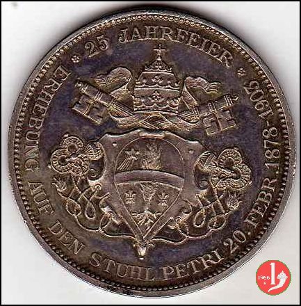 20-XXV Anno di Pontificato Tedesca Dritto: LEO XIII _ PONT. MAX. busto a dx con berretto, mozzetta e stola Stemma Papale in cartella, su chiavi decussate, coronato da triregno | |