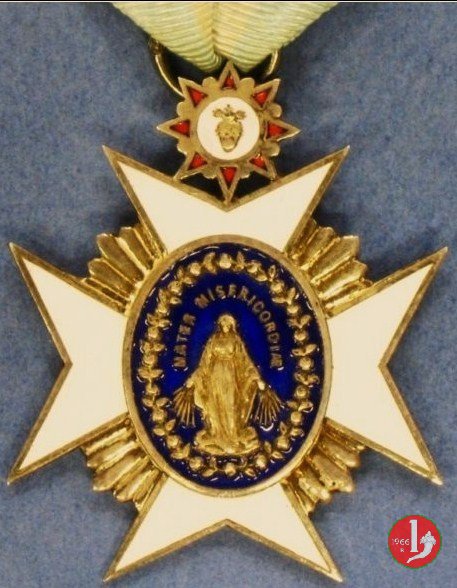 8- Decorazione Mater Misericordiae Dritto: entro rami d'alloro, doratura su sondo a smalto blu: MATER MISERICORDIAE la B. V. in piedi di fronte, con mani raggianti | |