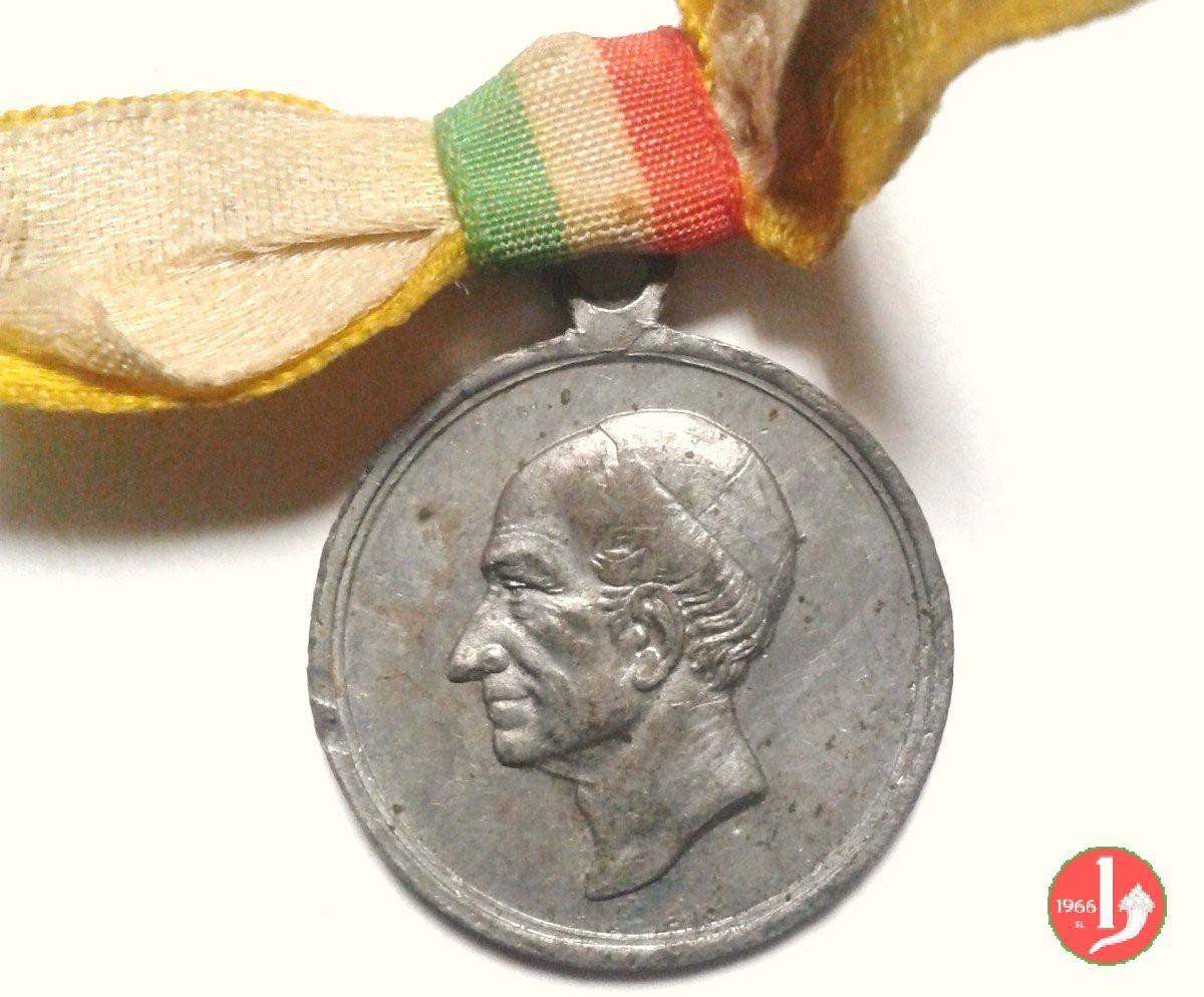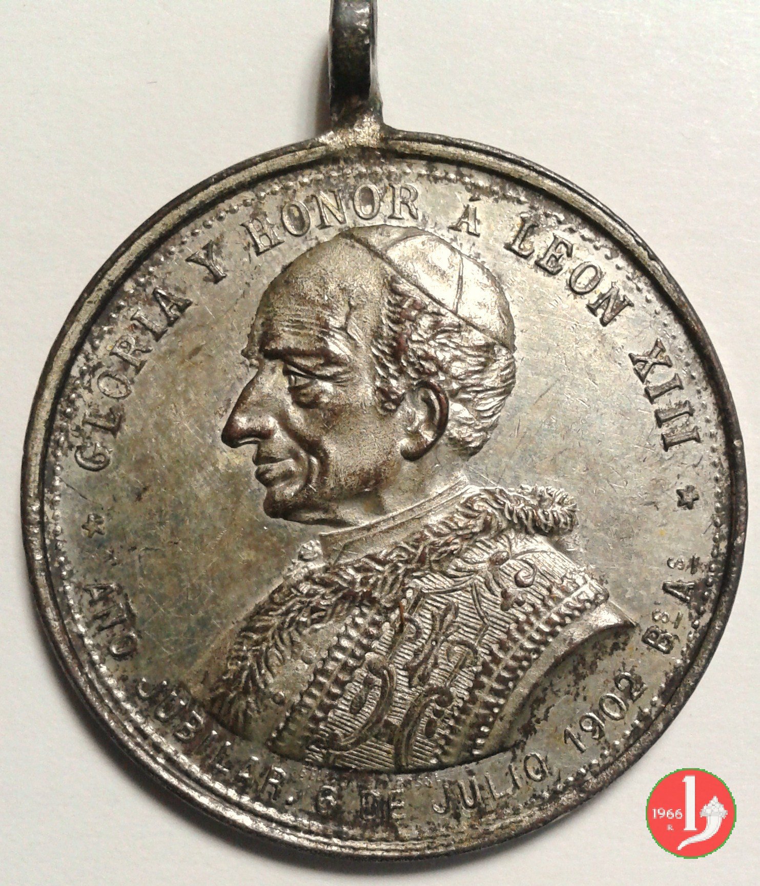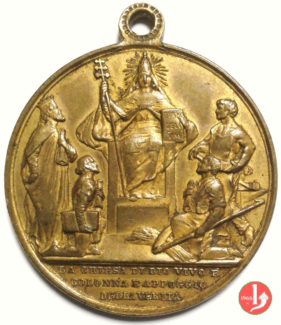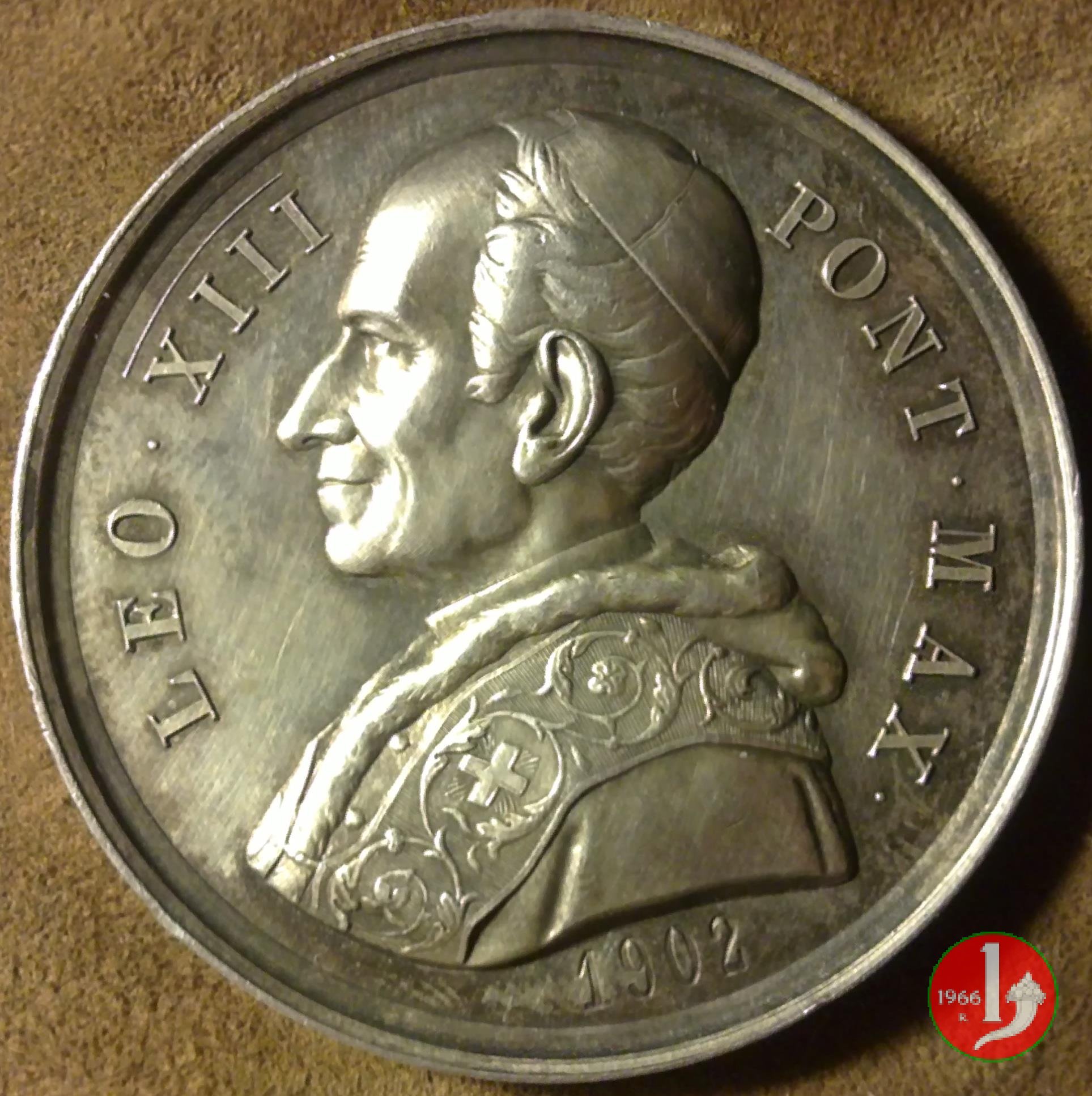 30-25° Pontificato all'Amatissimo 47mm Dritto: LEONE XIII P. M. LUCE DI SAPIENZA CRISTIANA = ✠ MCMII ANNO XXV DEL PONTIFICATO ✠ busto a sx con berretto, mozzetta e stola a dx, presso il bordo interno: JOHNSON nel campo: LEONE XIII° = NELL'ANNO XXV DEL SUO = PONTIFICATO = - = GLI AMMESSI ALLA PRIMA = COMUNIONE = DELLA PARROCCHIA DI = S. MARIA DELLE GRAZIE AL NAVIGLIO = DI MILANO = CON GIUBILO OFFRONO = QUESTO SEGNO D'AMORE = INVOCANDO LA SUA = PATERNA BENEDIZIONE = 20 APRILE 1902 in basso, circolarmente: FANCIULLI 210 RAGAZZE 230 | |