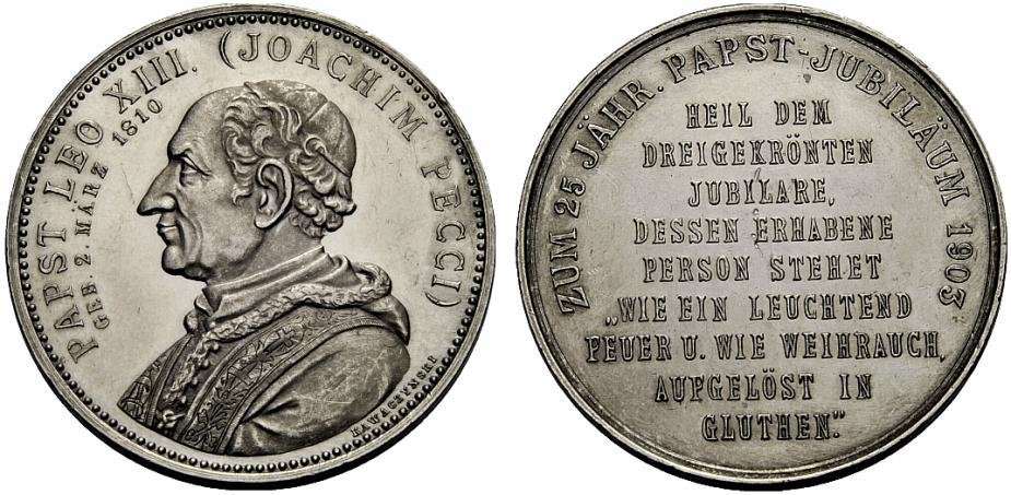 32- Giubileo Papale-Heil Dem Dreigekronten Dritto: PAPST LEO XIII. (JOACHIM PECCI) = GEB. 2. MARZ 1810 busto a sx con berretto, mozzetta e stola sotto: KAVACZYNSKI nel campo: HEIL DEM = DREIGEKORONTEN = JUBILARE. = DESSEN ERHABENE = PERSON STEHET = "WIE EIN LEUCHTEND = PEUER U. WIE WEIHRAUCH. = AUFGELOST IN = GLUTHEN." | |