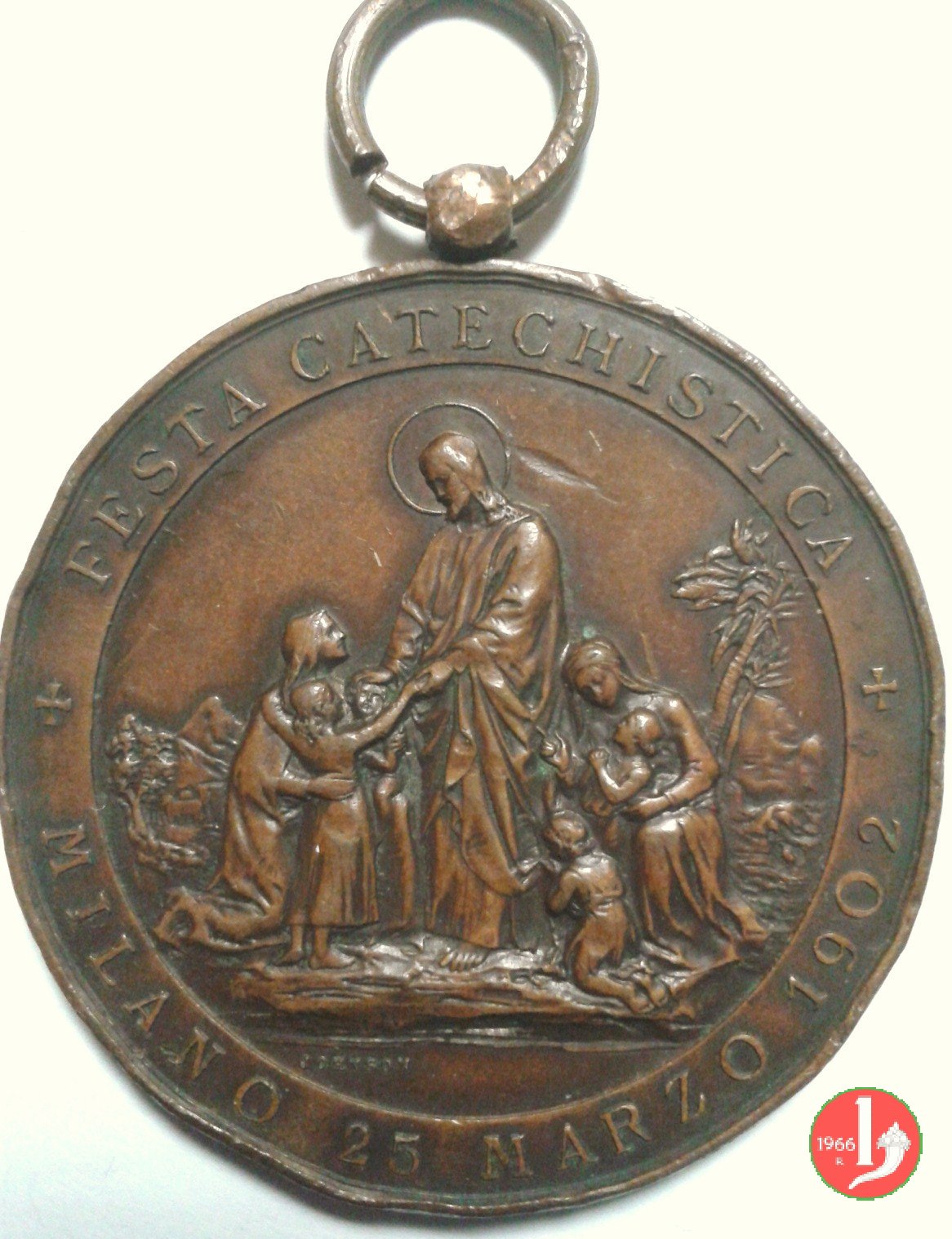 10-Festa catechistica a Milano 25-3-1902 Dritto: • LEONE XIII LUCE DI SAPIENZA CRISTIANA • = ✠ MCMII A • XXV DEL PONTIF. ✠ busto a sx con berretto, mozzetta e stola sotto: S • J • Gesú, in piedi verso sx, nimbato, attorniato da fanciulli in esergo, a sx: JOHNSON | |