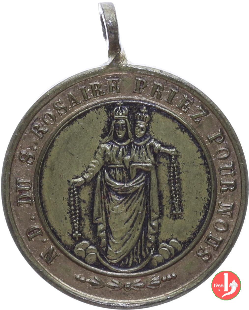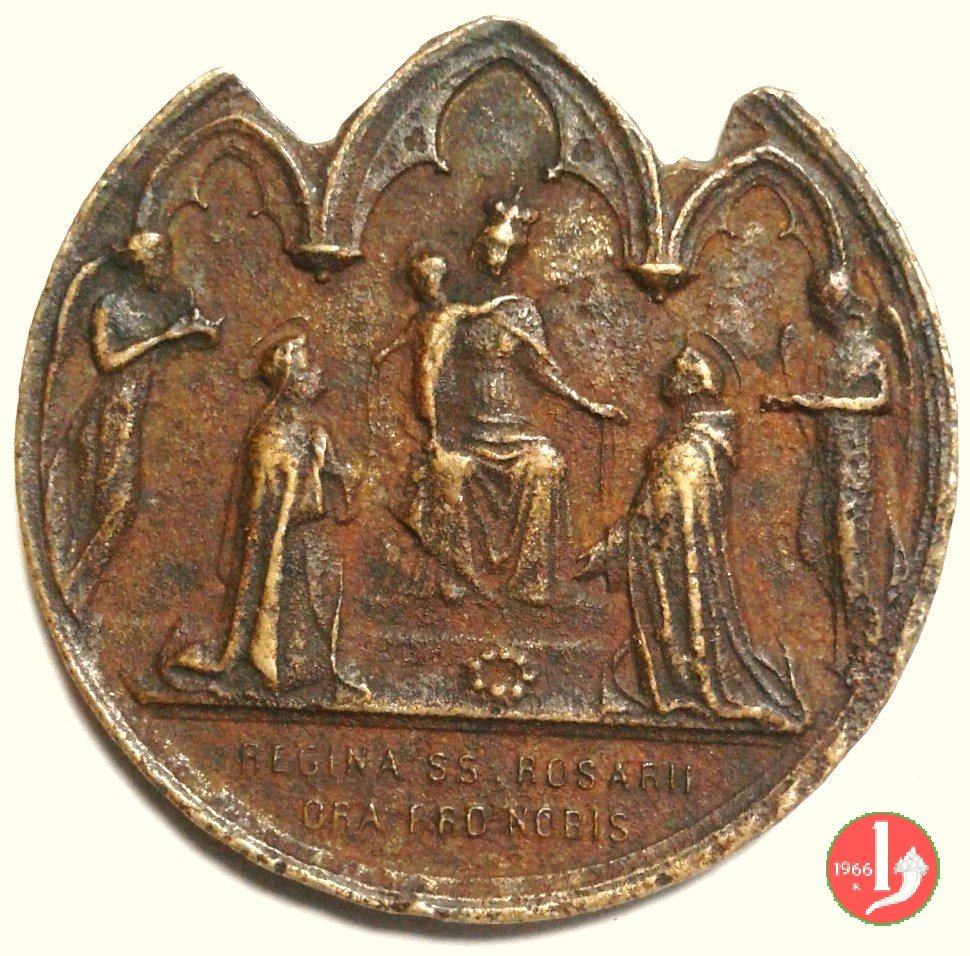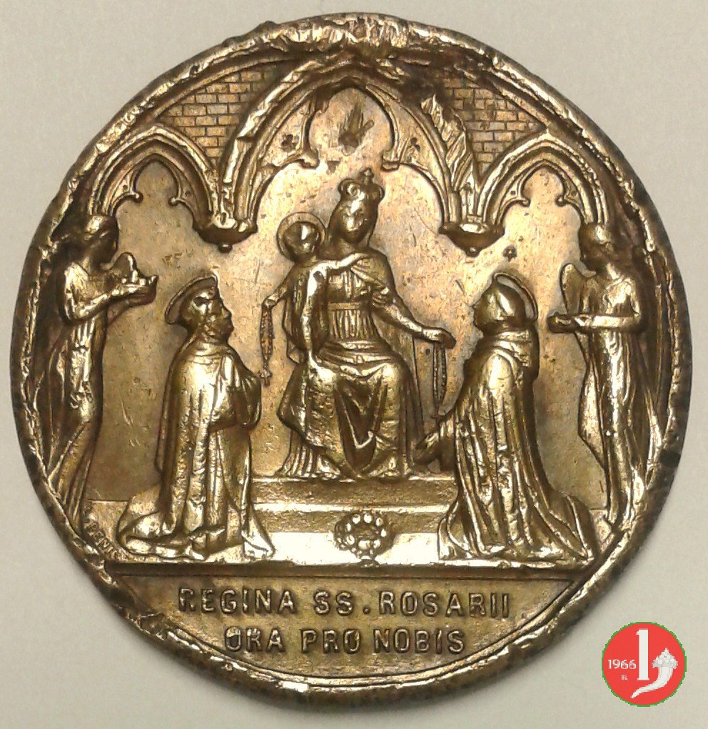 entro cerchio continuo: la B. V. Maria coronata, in piedi, regge Bambino e corona del S. Rosario su nubi, reggono corone del SS. Rosario