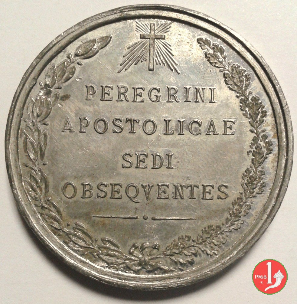 Verso: entro rami di alloro e di quercia legati da nastro in basso e sormontata da Crocefisso raggiante: PEREGRINI = APOSTOLICAE = SEDI = OBSEQVENTES
