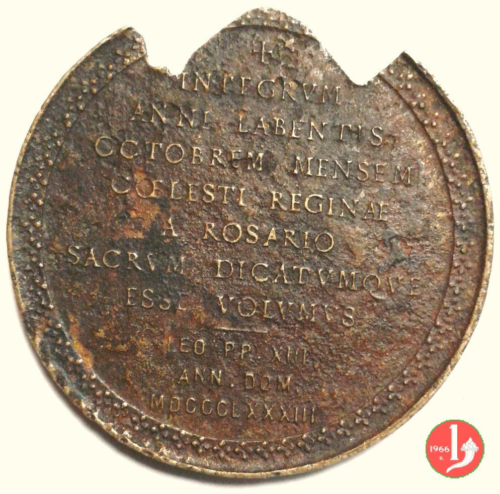 Verso: nel campo: ✠ = INTIGRVM = ANNI LABENTIS = OCTOBREM MENSEM = COELESTI REGINAE = A ROSARIO = SACRVM DICATVMQVE = ESSE VOLVMVS = - = LEO PP. XIII = ANN. DOM. = MDCCCLXXXIII