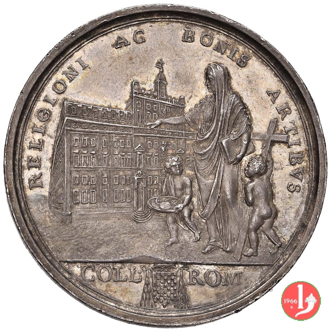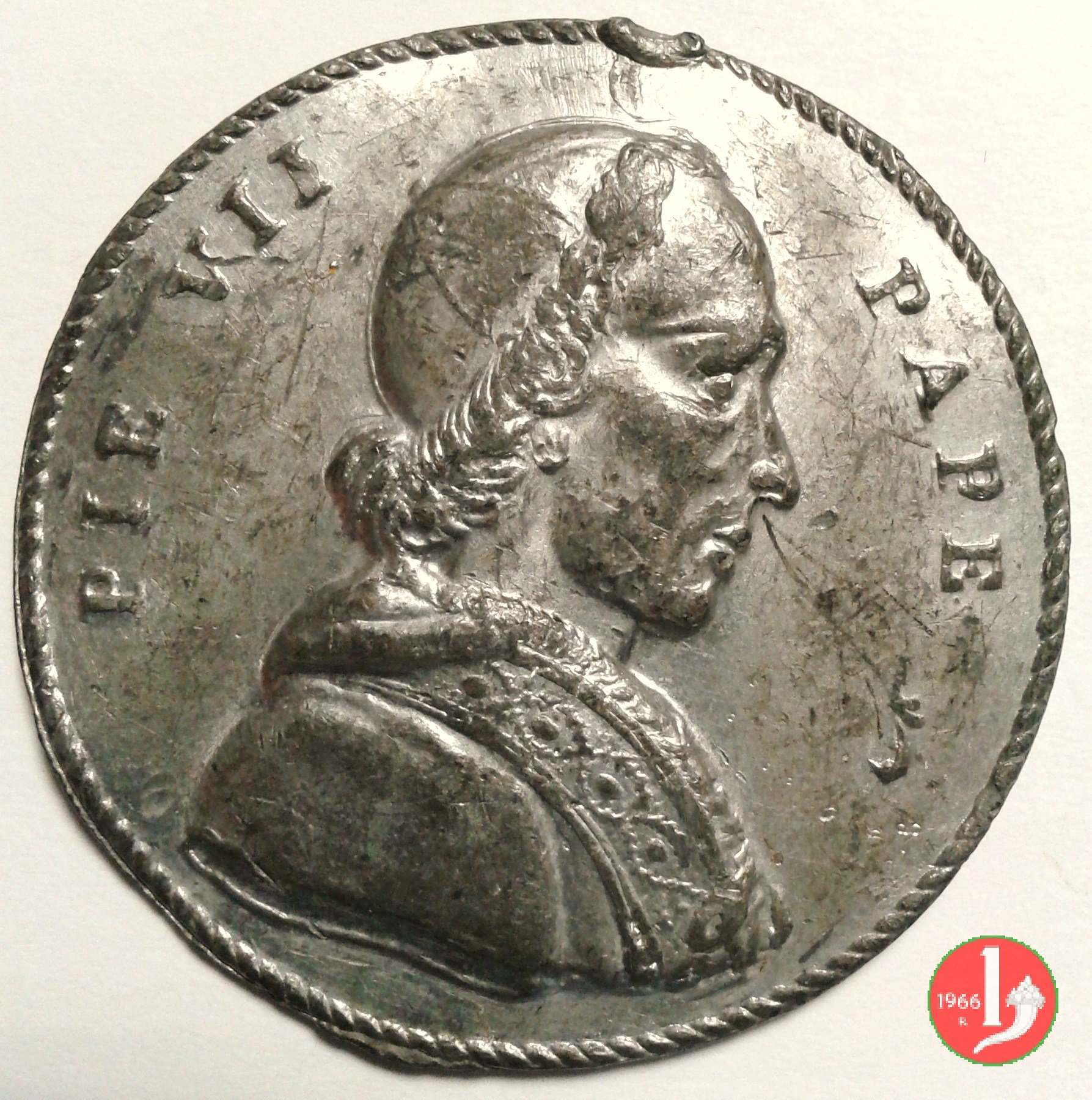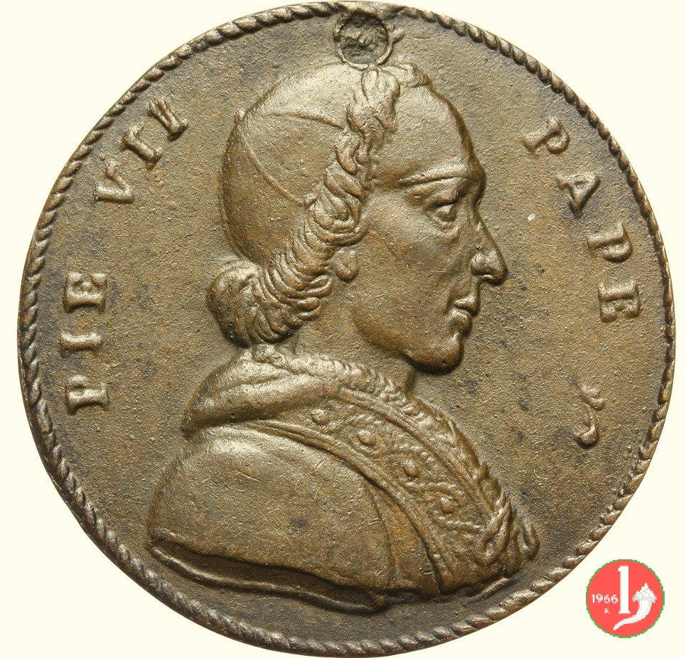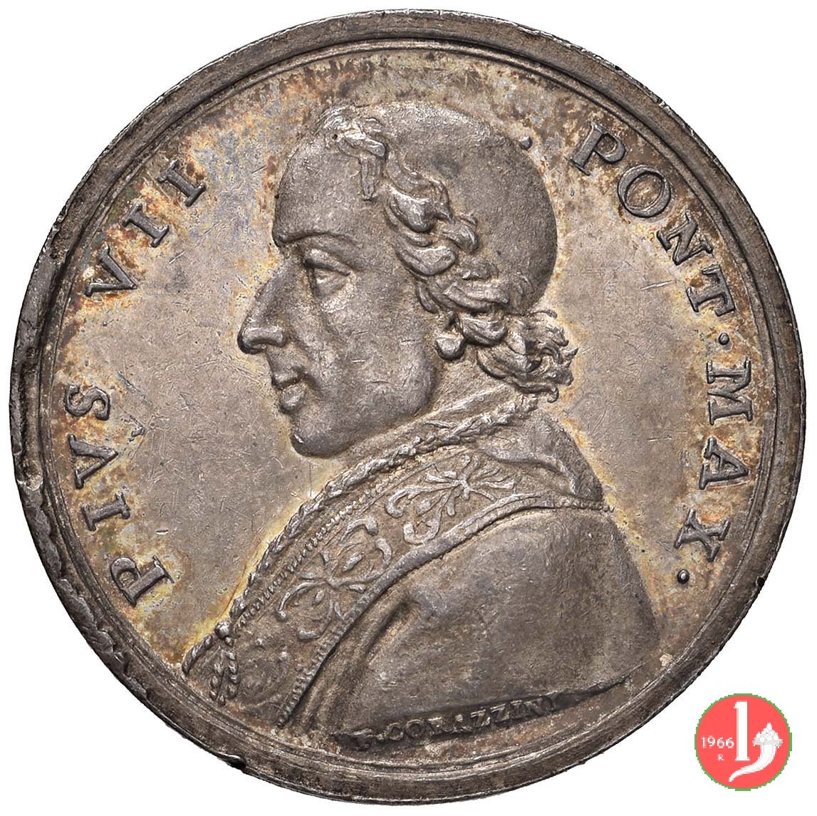 Premio Alunni Collegio Romano A. VI -Be73 Dritto: PIVS VII _ PONT • MAX • busto con mozzetta e stola a sx sul taglio spalla: P • CORAZZINI Vista del Collegio Romano, con la Religione e due geni in esergo, ai lati dello Stemma del Card. Litta: COLL • _ ROM • |