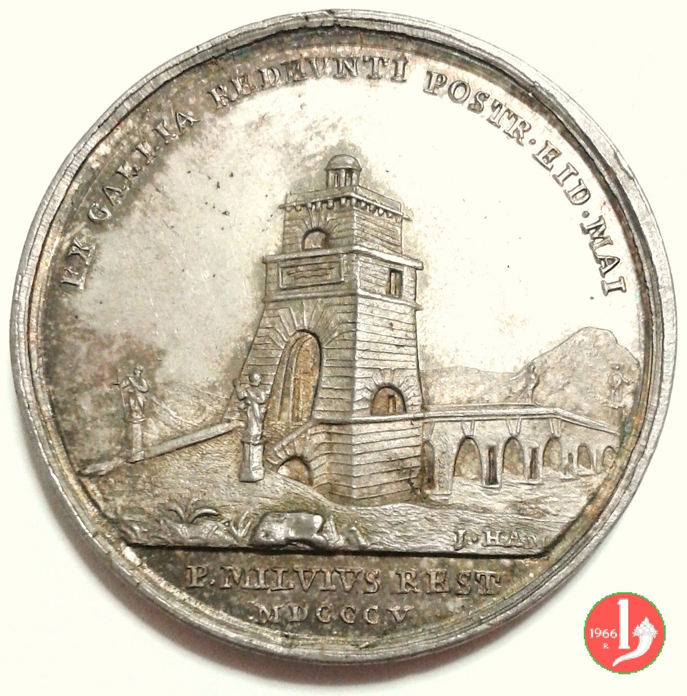 A. VI - Rientro del Papa da Parigi - P. Milvio -Be72 Dritto: PIVS VII _ P * M * AN * VI busto con berretto, mozzetta e stola a sx vista del Ponte Milvio restaurato sotto, a dx: J • HAM in esergo: P • MILVIVS REST = MDCCCV | |
