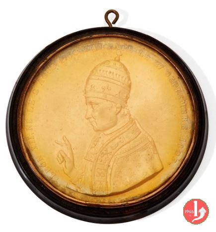 N. S. tra le nubi ponte triregno sul capo del Pontefice genuflesso verso sx