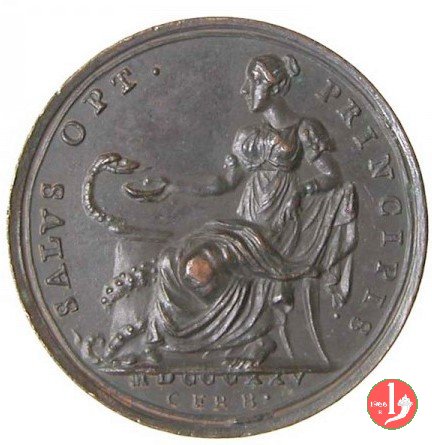 La figura allegorica della Salute (Igea) seduta a sx, offre latte a serpente di Esculapio avvolto a base circolare