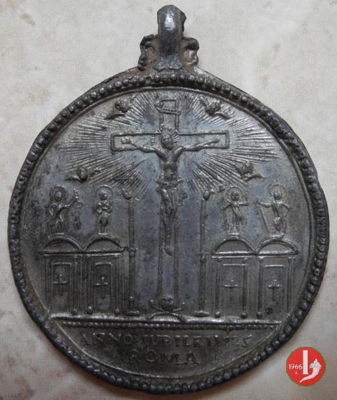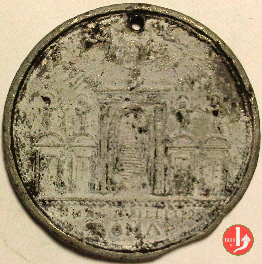 Verso: Il Papa in piedi, volto a sx, con mitra e piviale, attraversa la Porta Santa, regge Croce astile e cero ed è assistito dalla corte